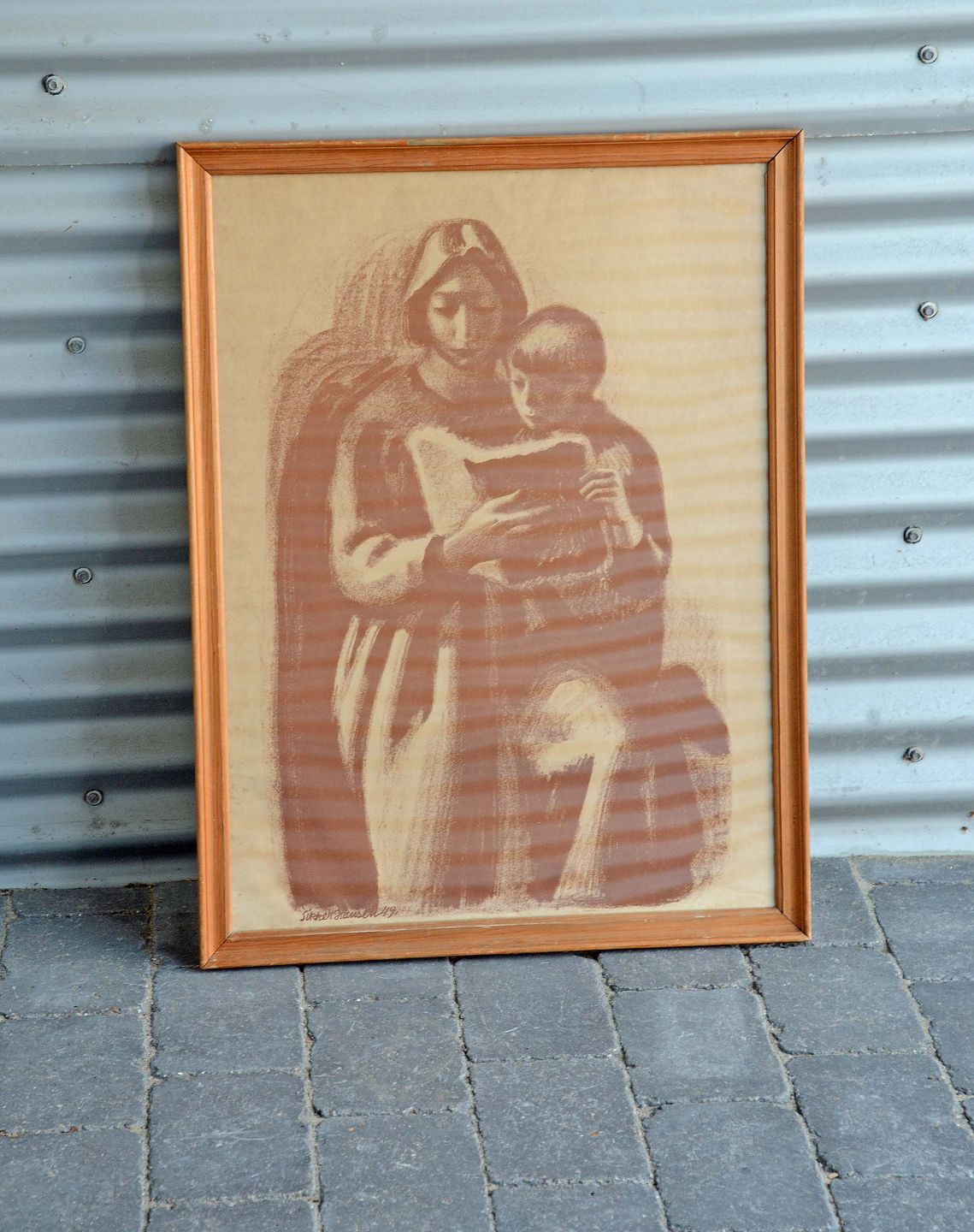 Indrammet print med motiv af mor med barn af Sikker Hansen. Det er i pæn stand. H. 75 cm. B. 56 cm.