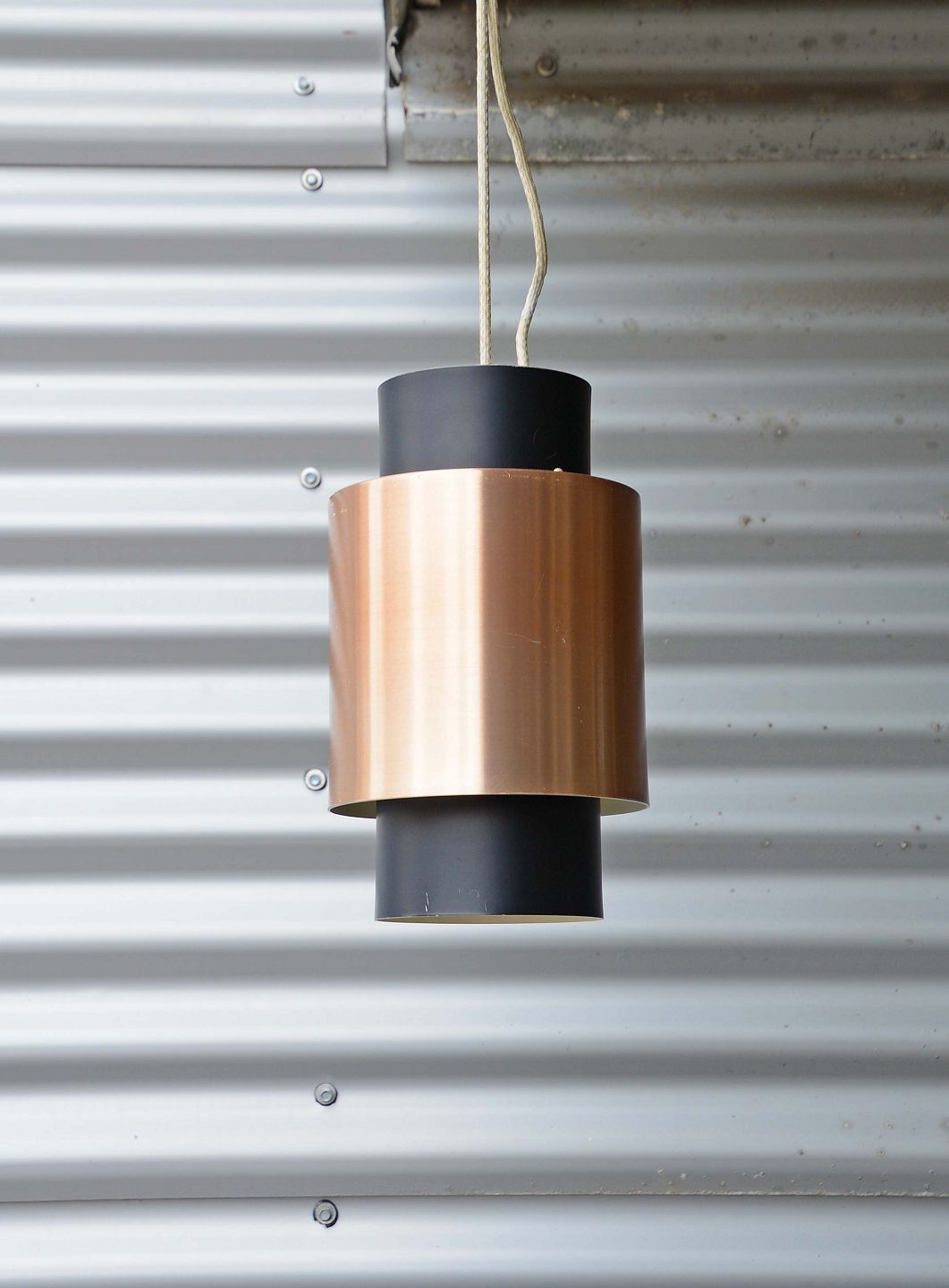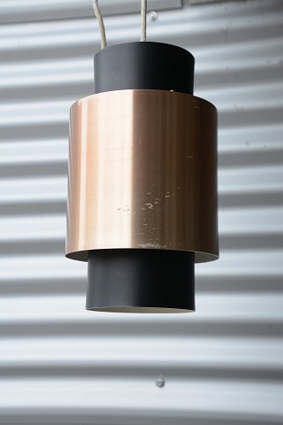 Tunika Loftspendel i sortlakeret og kobber-lakeret aluminium skærm. Fog og Mørup, design af Jo Hammerborg. Lidt ridser på kobberlakeret skærm.