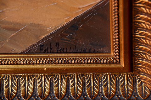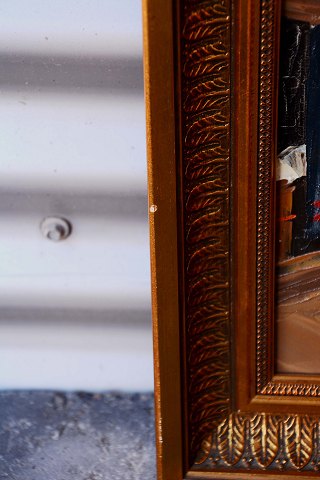 Maleri på lærred af indendørsmiljø. Lille afslag i rammen. Pæn stand.