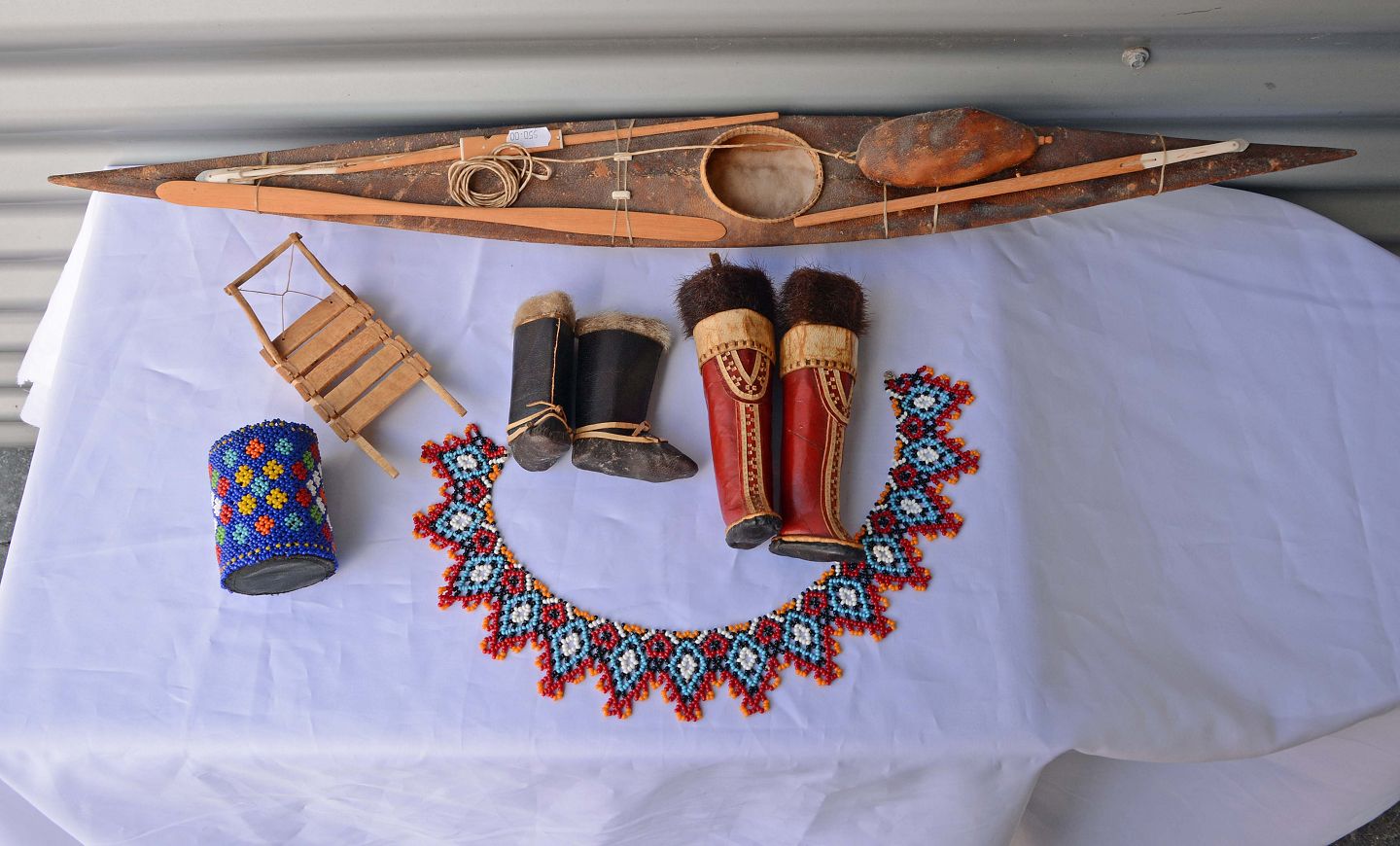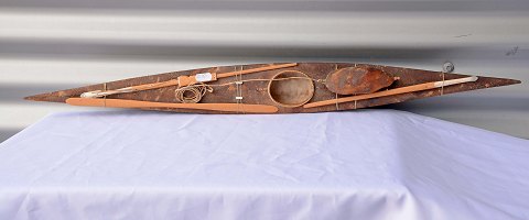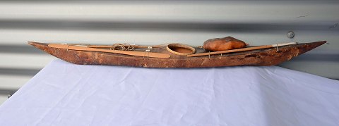 Kajak i sælskind med fangstredskaber i træ og metal. L. 75 cm. B. 8,5 cm. H. 5-7 cm. Pris 550 kr.