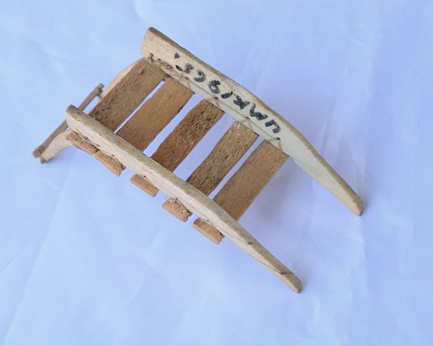 Slæde i ben fra 1965. Tuschskrift under bunden H. 6 cm. B. 6,5 cm. L. 14 cm.