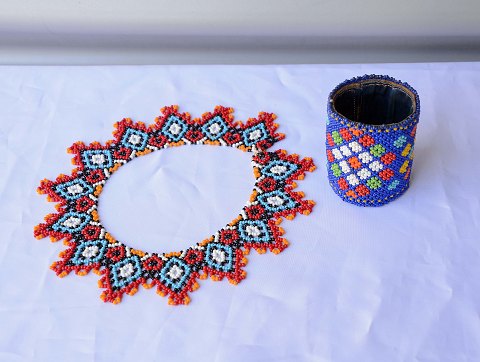 Bæger i sælskind og perler. H. 7,5 cm. Ø. 6 cm. solgt