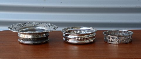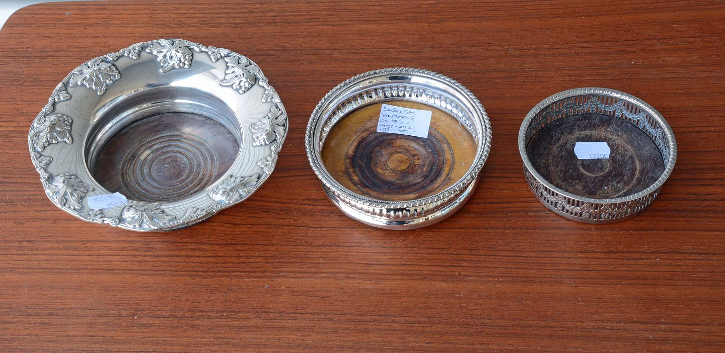 3 stk. engelske vinbakker i sølvplet med bund i mahogni fra år 1880-1900.