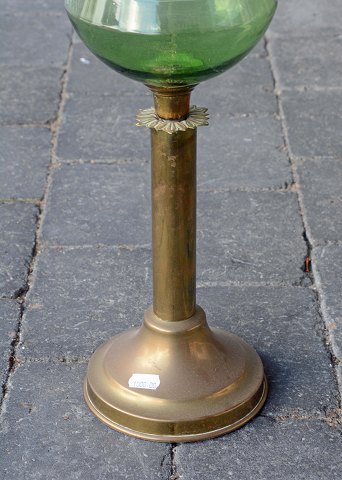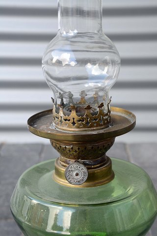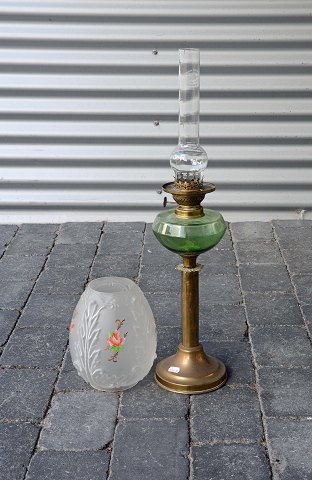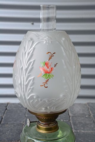Petroleumslampe med fod af messing. Glasskærm med motiver af roser. Et mindre nøk i kanten af inderste lampeglas ellers er den intakt og i pæn stand.