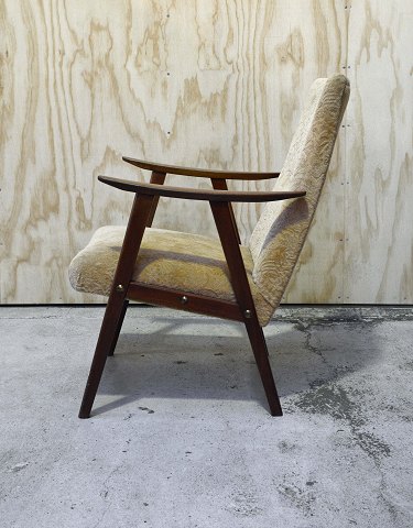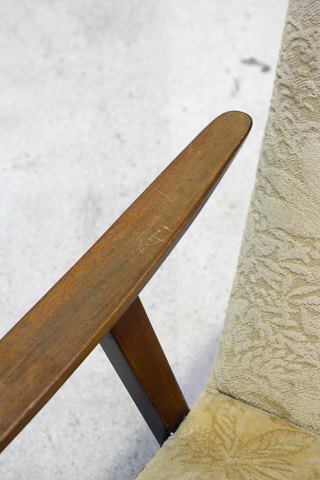 Armstol i teak med stofbetrukket sæde. Brugsspor på ben og armlæn. Intakt betræk.