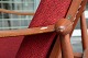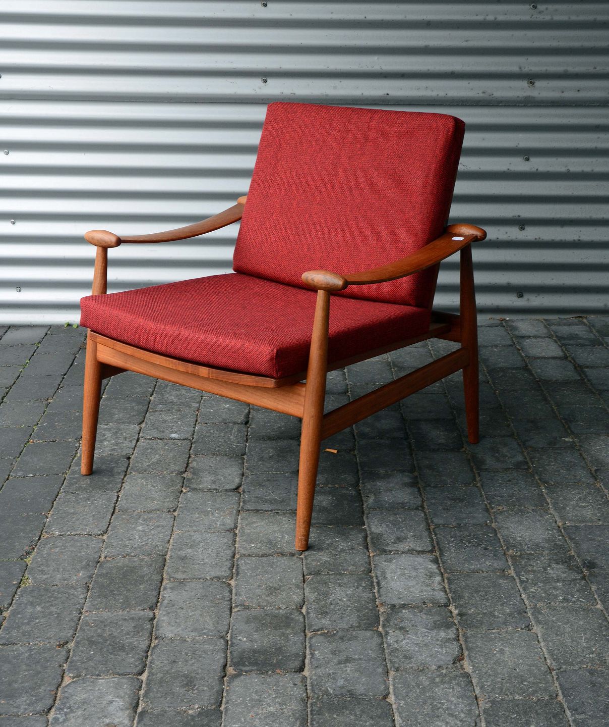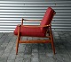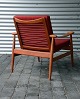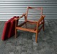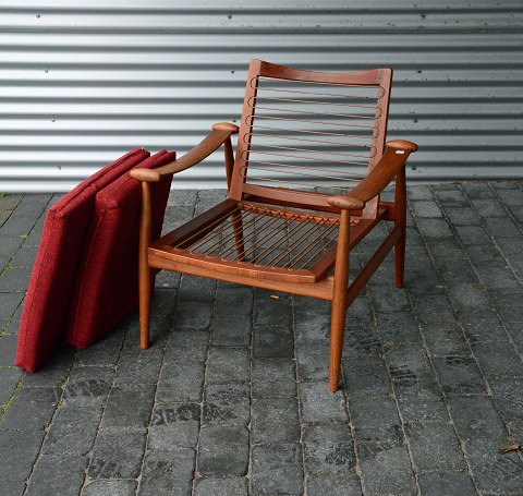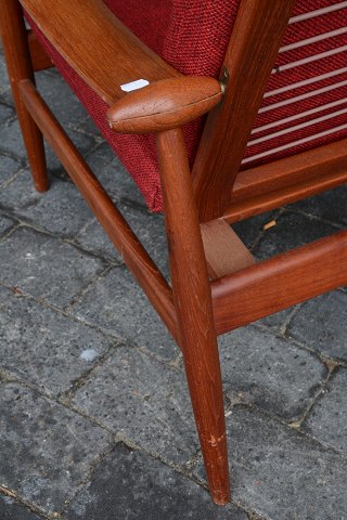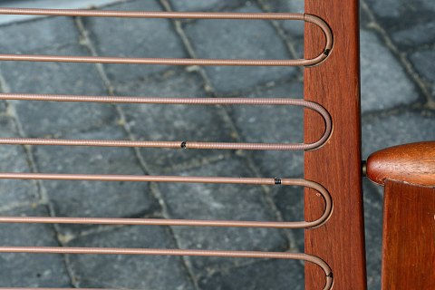 "Spaden" i teaktræ med polstrede hynder. Brugsspor på stellet og en skade på venstre armstøtte.