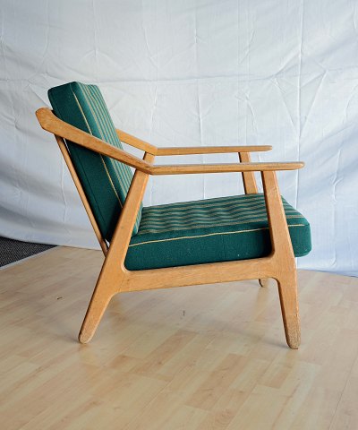 Tre styk lænestole med stofbeklædte hynder designet af H. Brockmann-Petersen. Intakte. Enkelte brugsspor på armlæn og sæder.