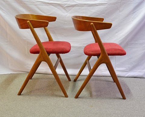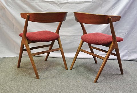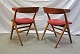 To Stole i teaktræ med rødt stofpostret sæde designet af Helge Sibast. Intakt med enkelte brugsspor.