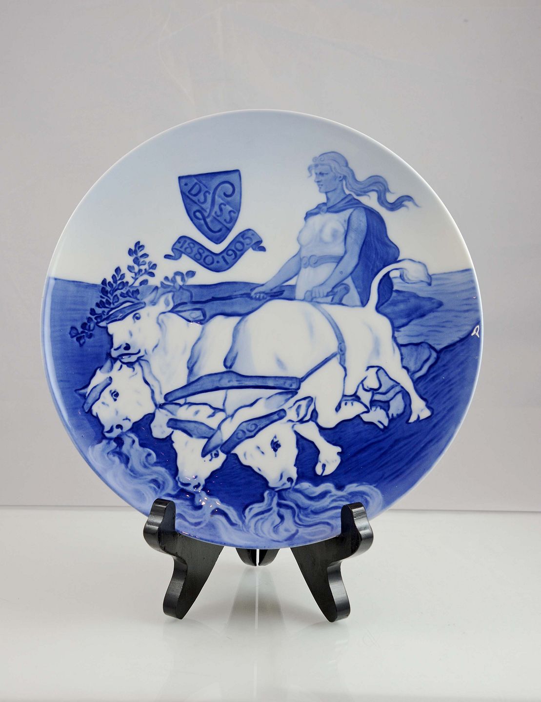 Kongelig vægplatte (nr. 85) fra Royal Copenhagen. Motiv Den nordiske gudinde Gefion bag ploven 1880-1905. Intakt. 1. sort.