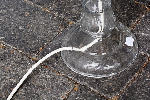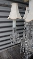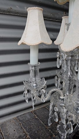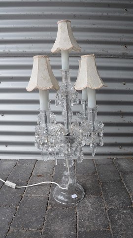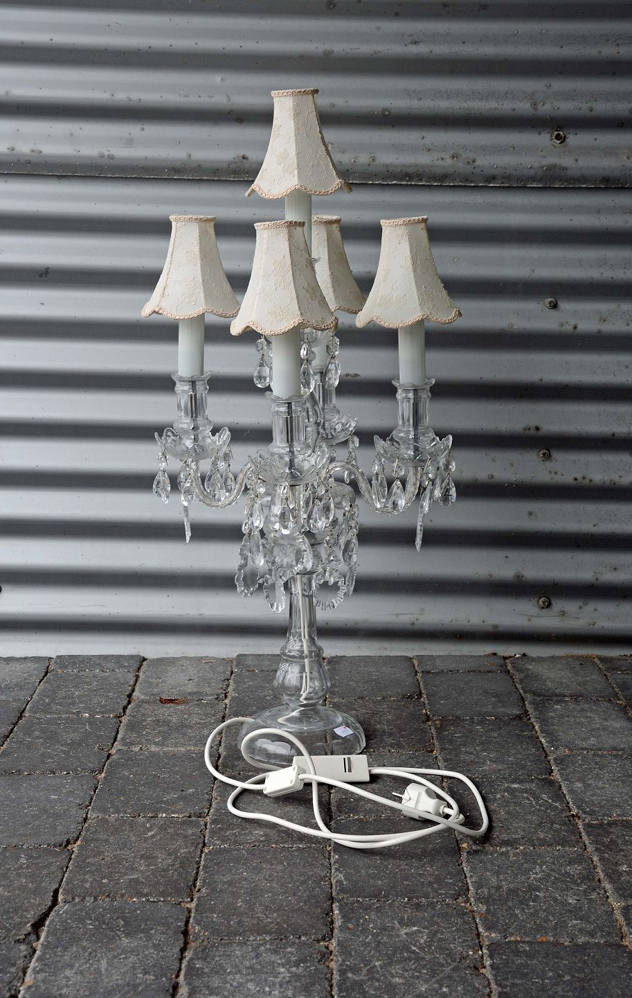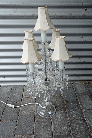 Høj glaslampe med 5 skærme med blondebroderi. Bordlampen fungerer og glasset er intakt.