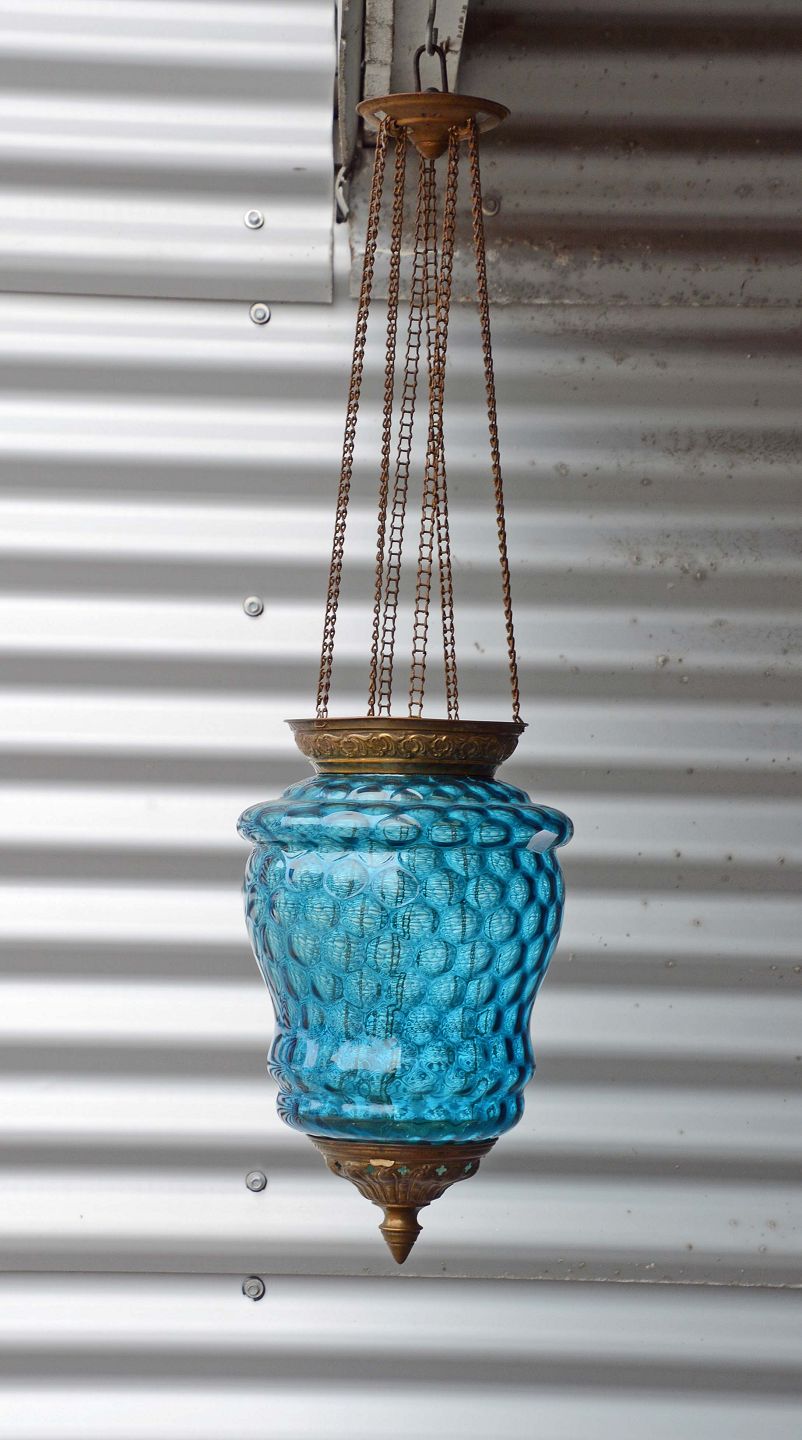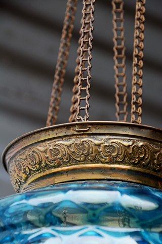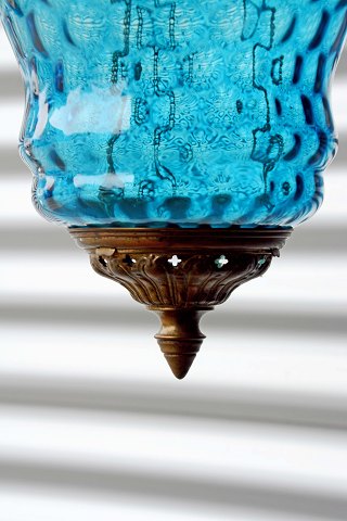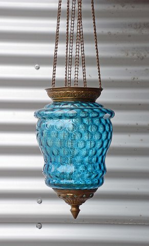 Den består af mønstret glas i en blå nuance, som er monteret på messingblik. Intakt glas med enkelte brugsspor på messingblik.