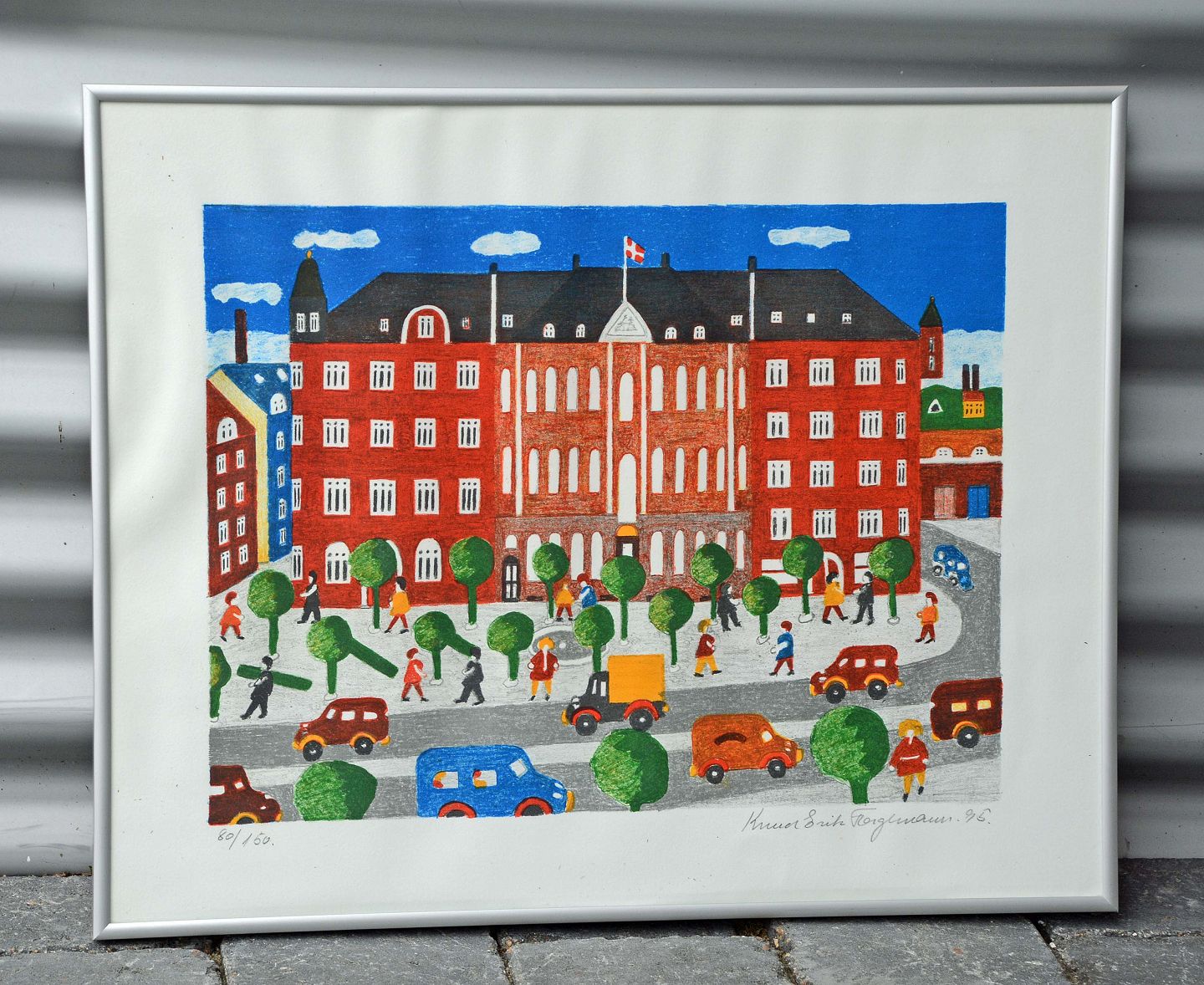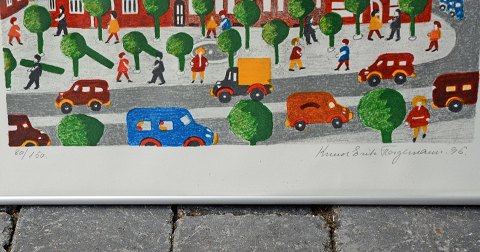 Indrammet tryk af Knud Erik Færgemann med motiv af byliv.