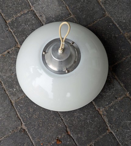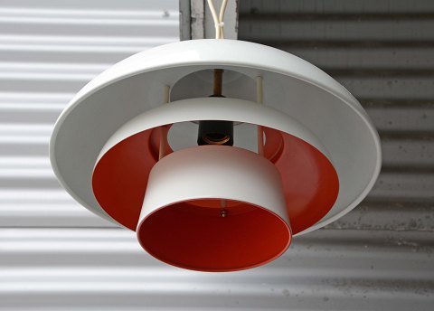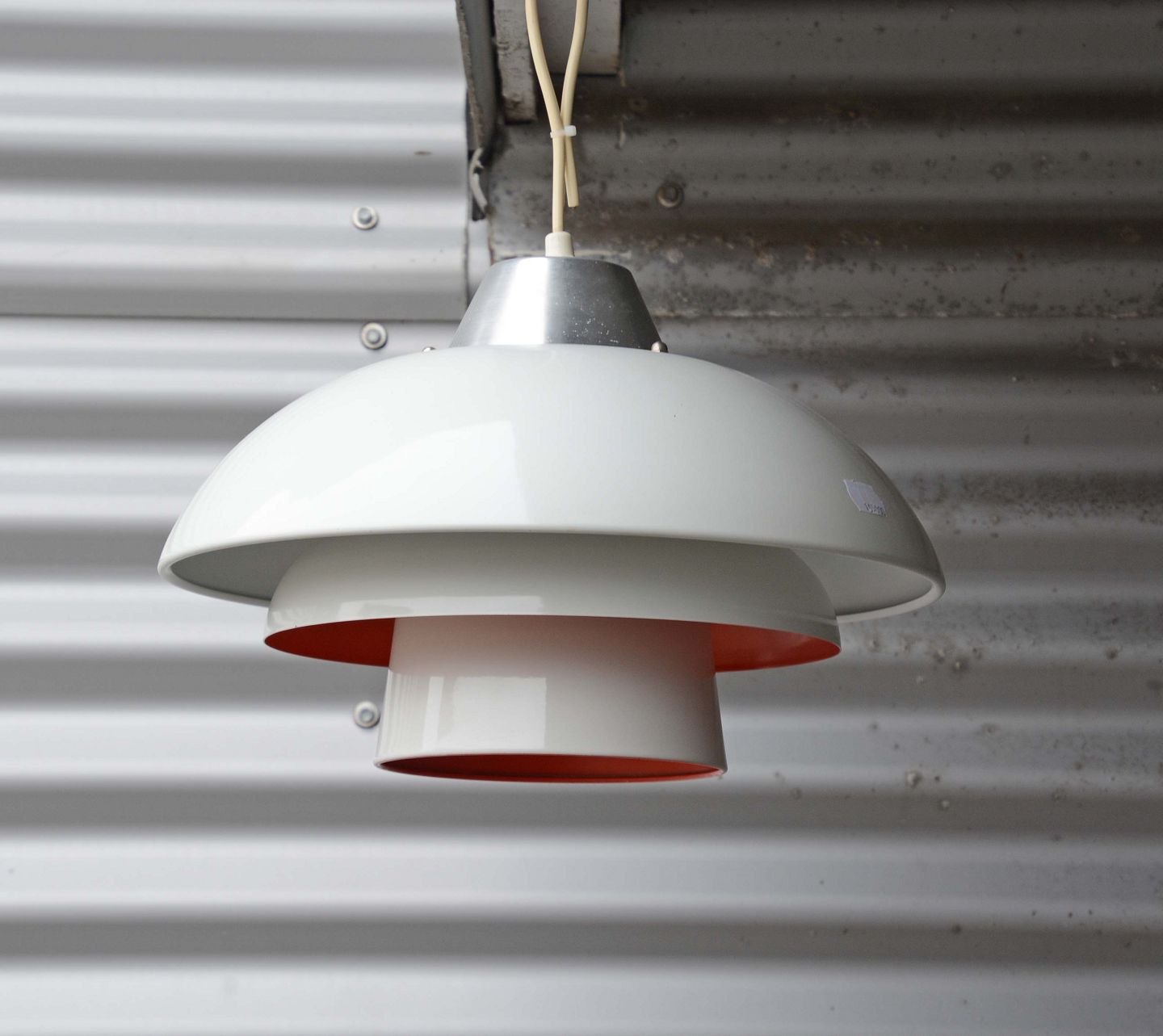 Loftslampe pendel i hvidlakeret metal med rød inderside. Brugsspor på skærmens yderside.