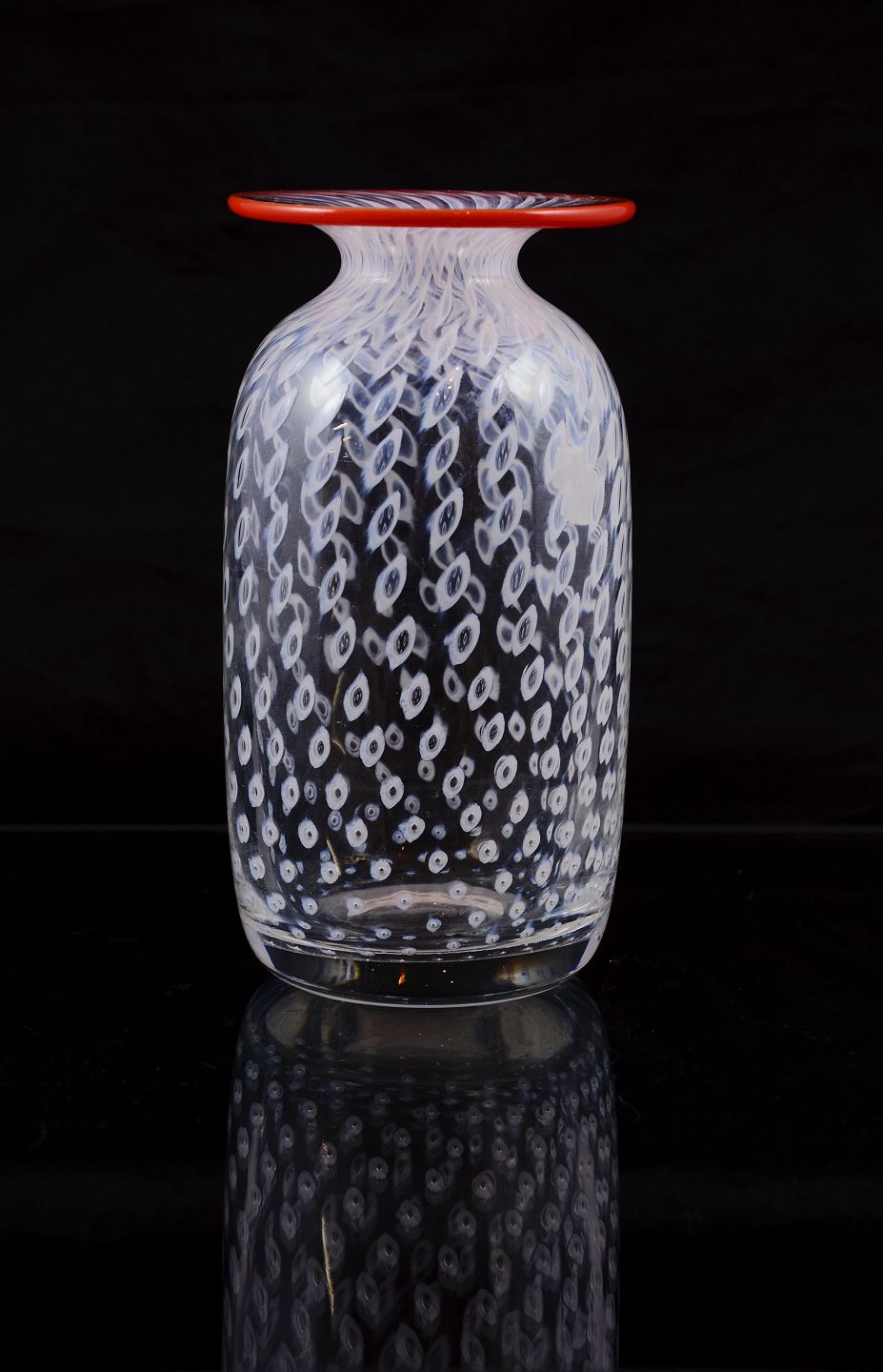 Glasvase med mønster og rød kant (nr. 48241) designet af Bertil Vallion for Kosta Boda Fors. Intakt med enkelte ridser under bunden.