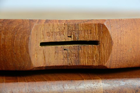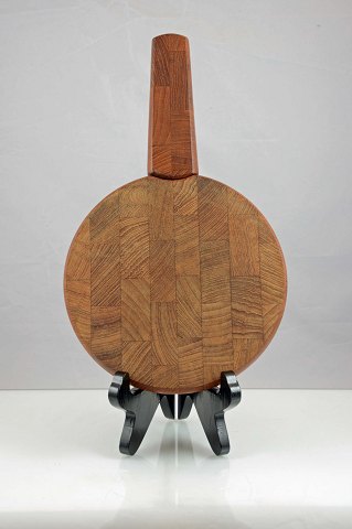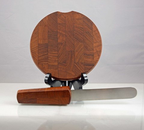 Rundt ostebræt i teaktræ med kniv fra Jens Harald Quistgaard. Stemplet JHQ. Intakt med overfladiske brugsspor. Det er den lille udgave, ses ret sjældent.