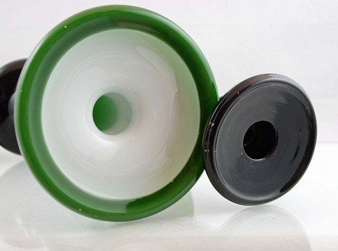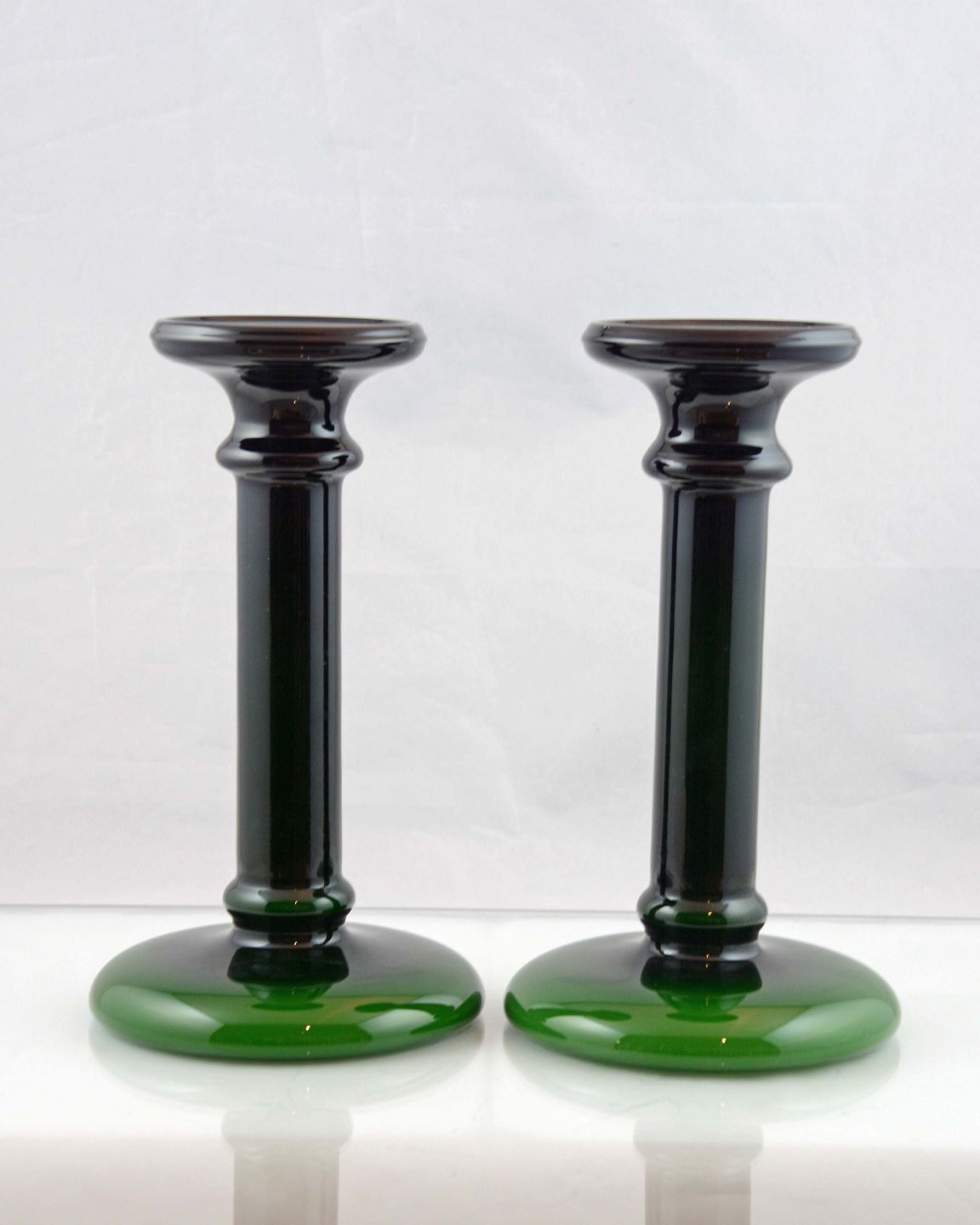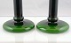 Et sæt grønne lysestager i glas fra Holmegaard. Intakte.