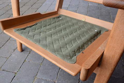 Lav lænestol model GE 290 i eg designet af Hans J. Wegner. Den viste stol er solgt, men vi har med andet stof i butikken.