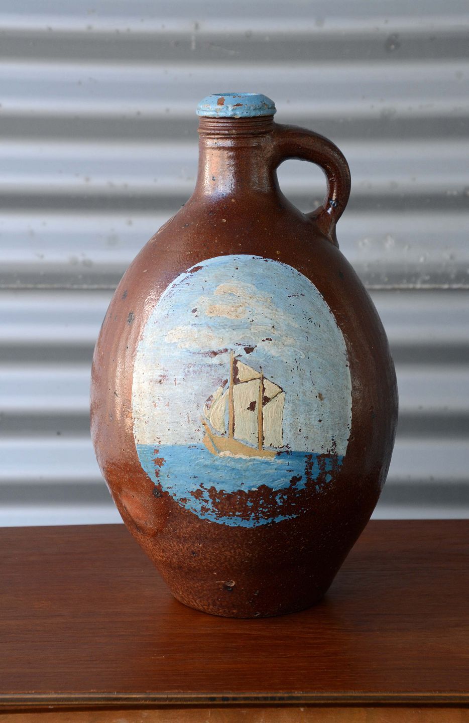 Skægmand vase/dunk i keramik fra år ca. 1850. Dunken har et afslag ved hanken og flere mindre afslag i glasuren.