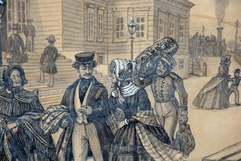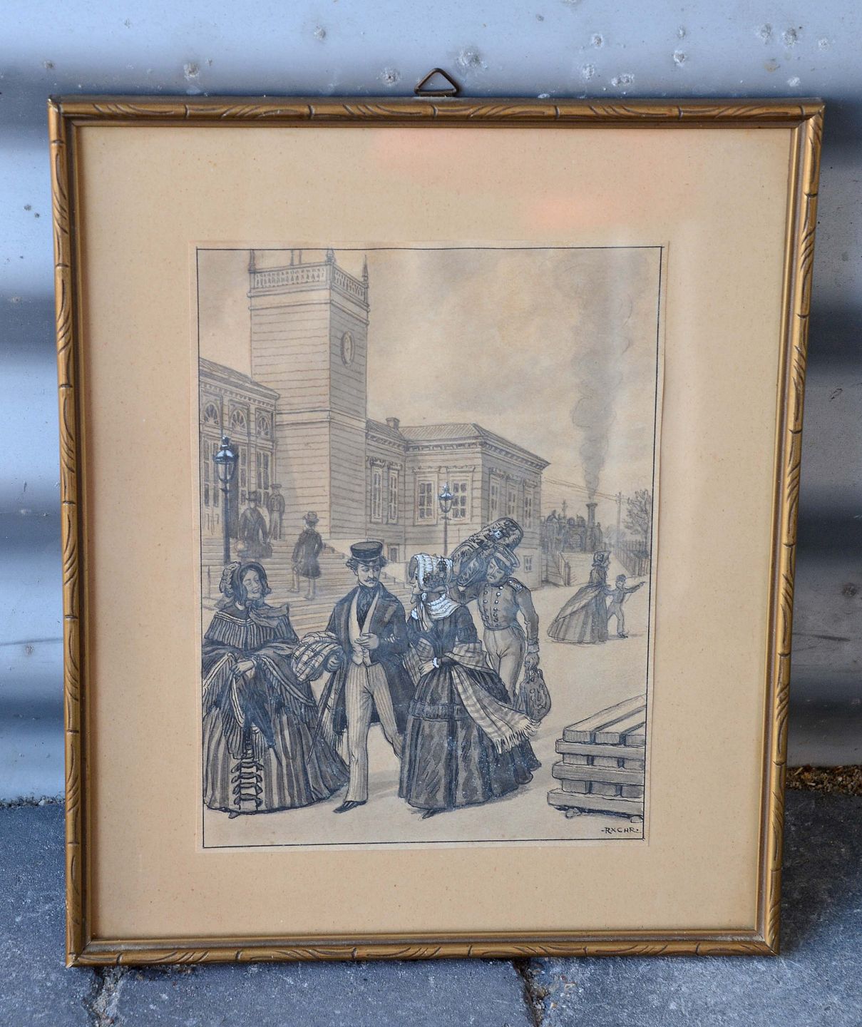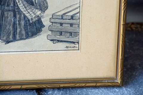 Delvist farvelagt tegning med motiv af mennesker i bylivet af Rasmus Christiansen (1863 – 1940). Signeret "RxChr". Intakt med brugsspor på rammen.
