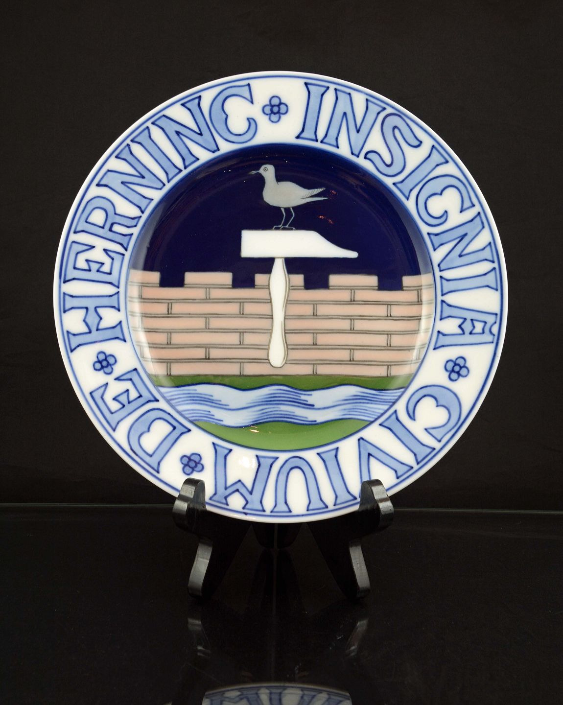 Vægplatte med motiv af Herning byvåben (nr.3144) fra Bing og Grøndahl. Intakt og 1. sort.