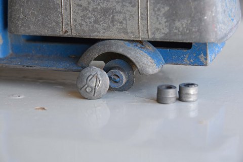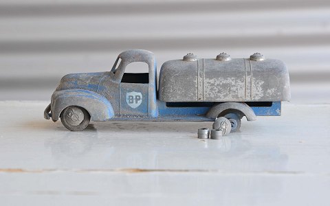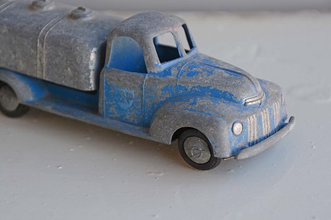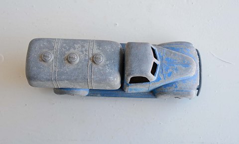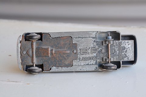 Legetøjsbil "BP" fra Brdr. Pedersen. Stemplet B.P. legetøj, Denmark. Bilen mangler et dæk, men hjulkapsel og enkeltdele medfølger. Fremstår med synlige brugsspor.
