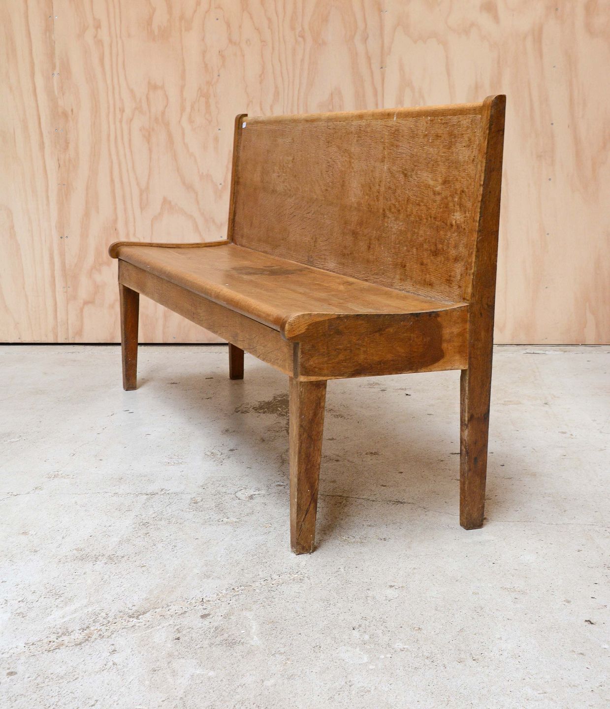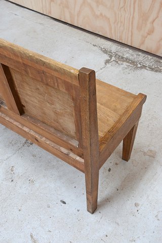 Bænk i eg fra ca. 1920érne. Fremstår med aldersrelaterede brugsspor.