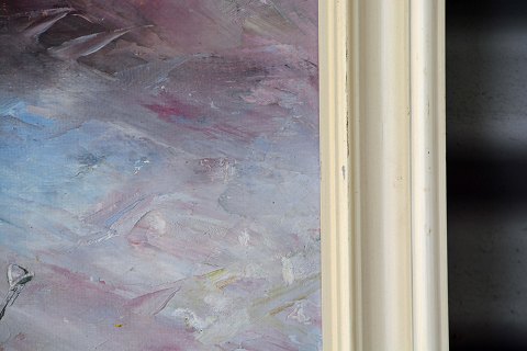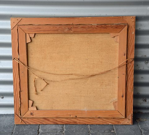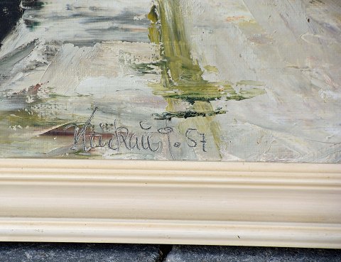 Maleri på lærred med motiv af skibe i havn. Maleriet er fra 1957 og signeret af Kai Rau. 1891-1957
