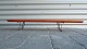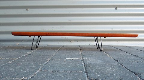 Langt serveringsbræt i teak på stel i sortlakeret metal. Fremstår med brugsspor på brættet.