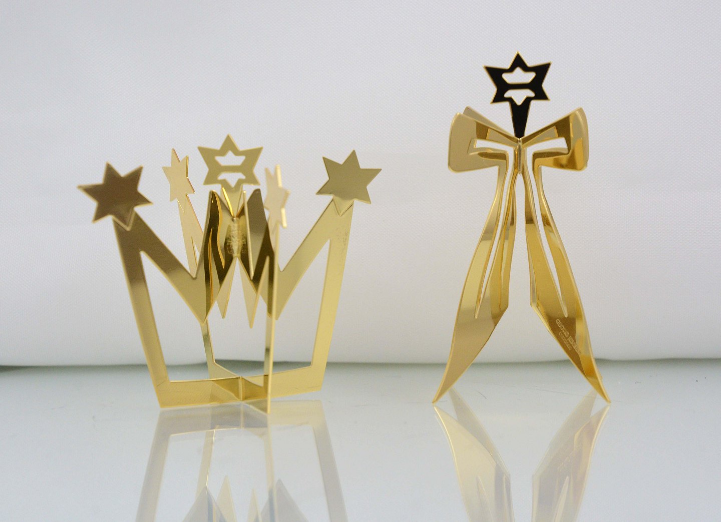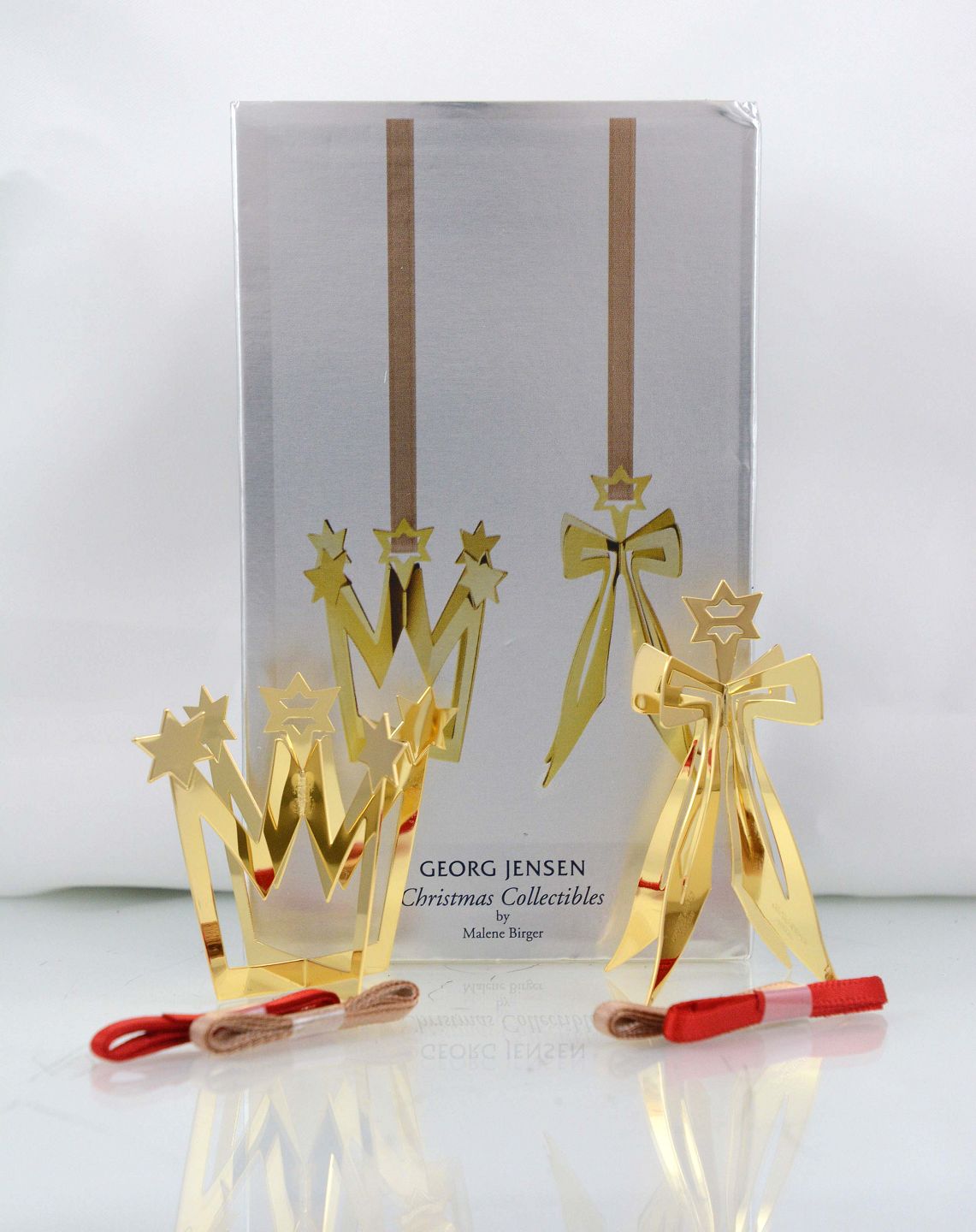 Georg Jensen julepynt. Sløjfe og krone udført i messing forgyldt med 24 karats guld. Christmas Collectibles designet af Malene Birger 2013.