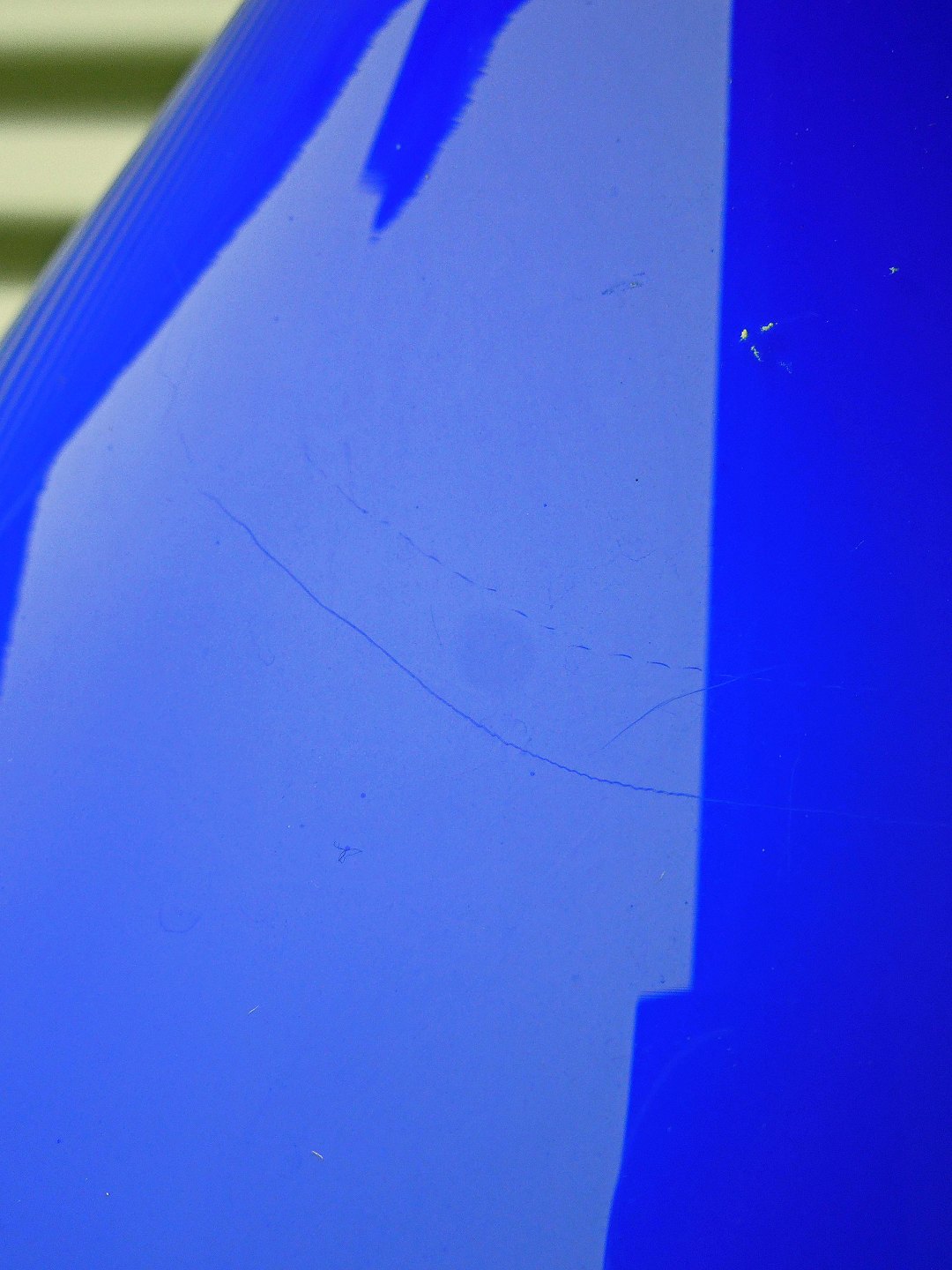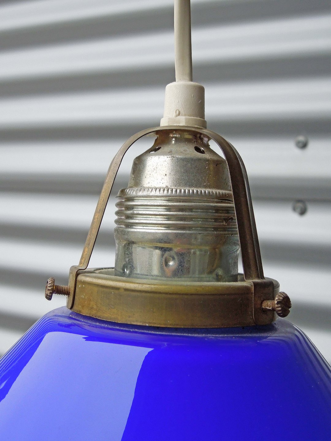 Loftslampe i glas med med messing ophæng. Pendlen er udformet i hvidt glas under blåt overfangsglas. Fremstår med mindre brugsspor.