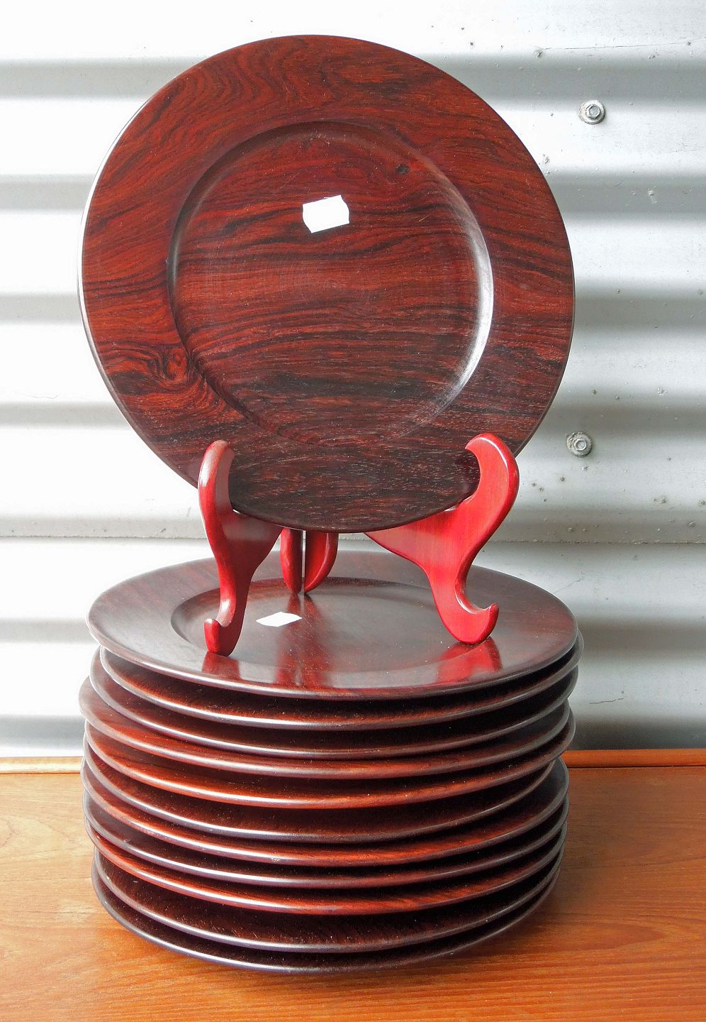 Dæktallerkener i lakeret palisander. Fremstår med overfladiske brugsspor - mindre ridser efter brug.