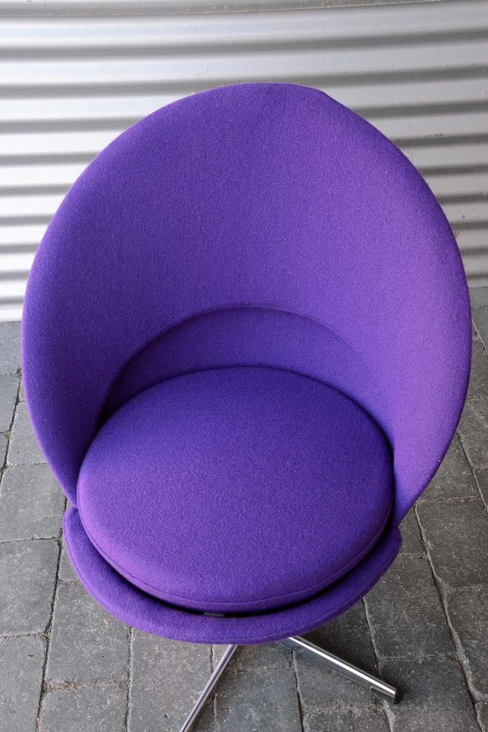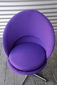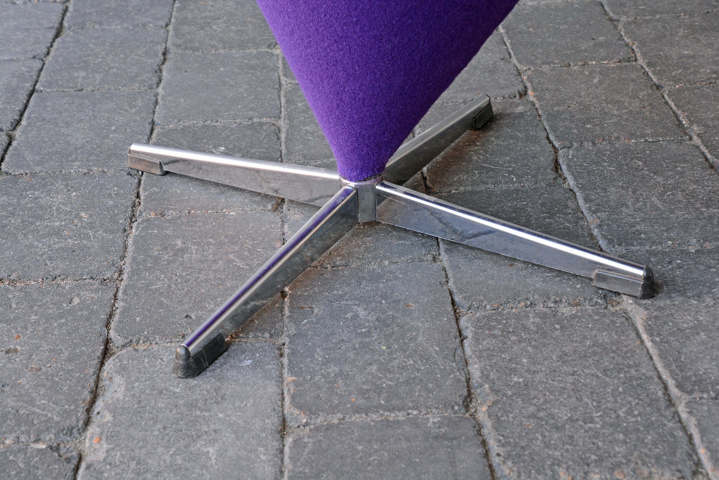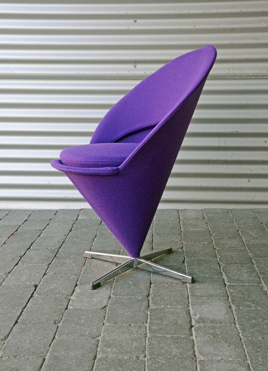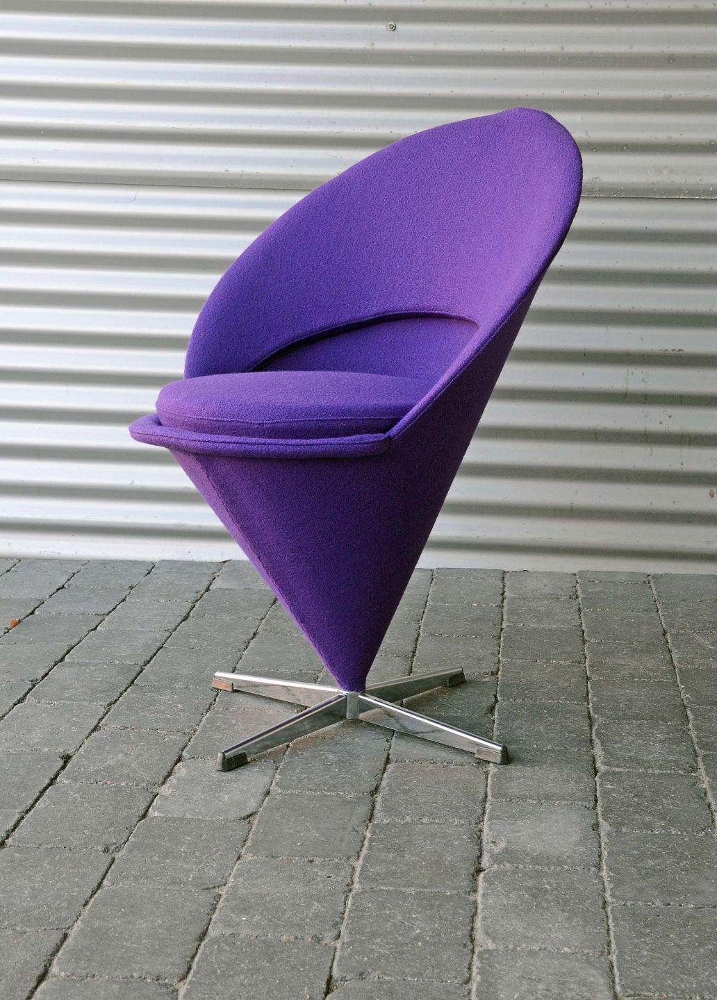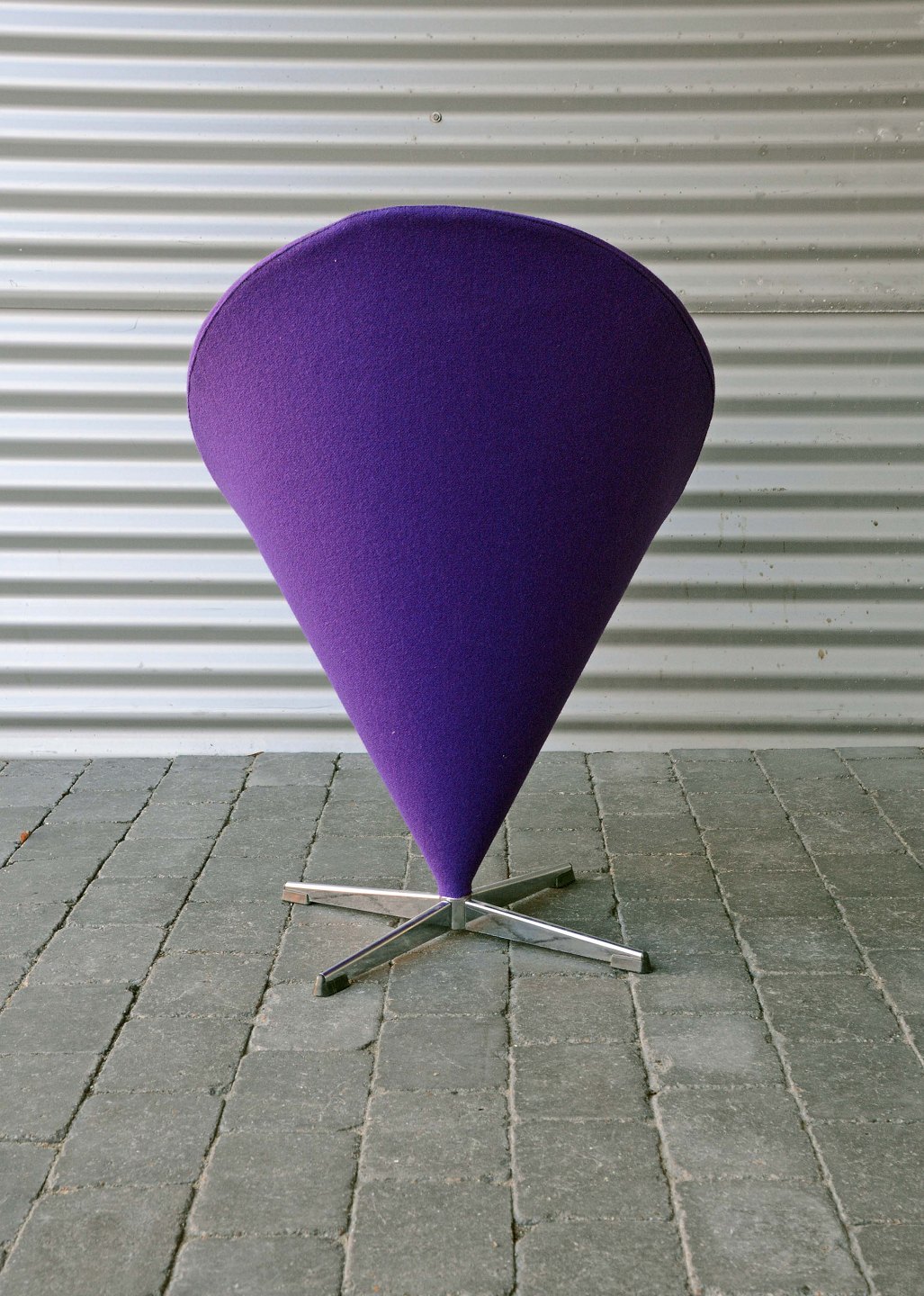 Mørklilla Cone chair designet af Verner Panton. Stolen her er den helt gamle model, med fjedre i pude. Fint stofbetræk og minimale brugsspor på stolens fod.