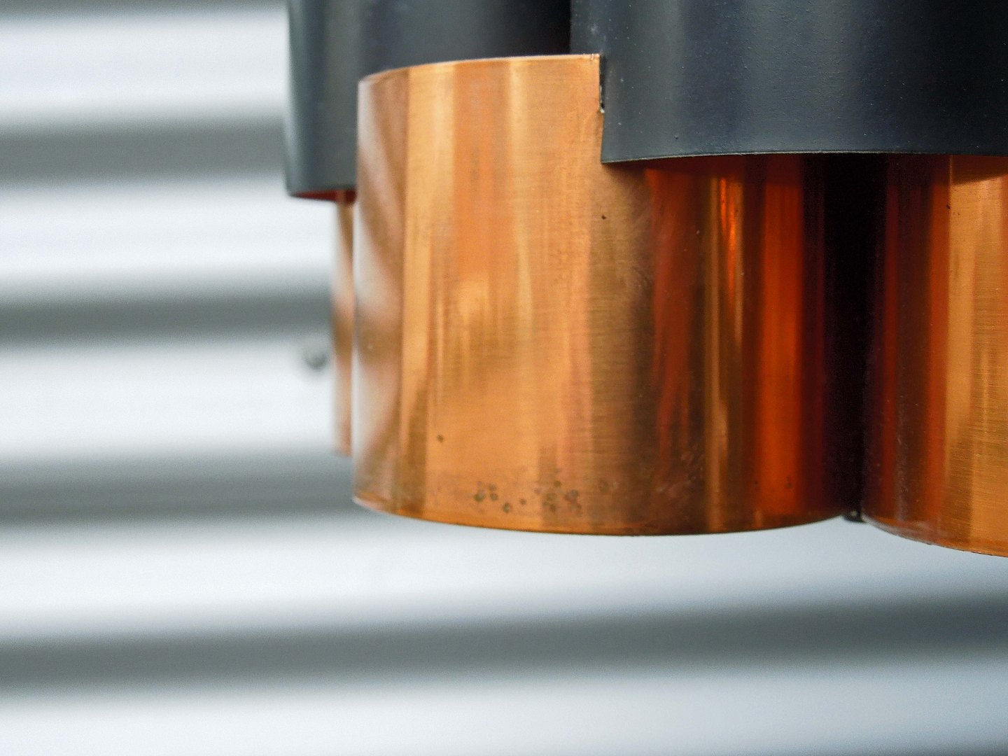 Loftslampe udformet af kobber og sortlakeret metal. Design fra Verner Schou.