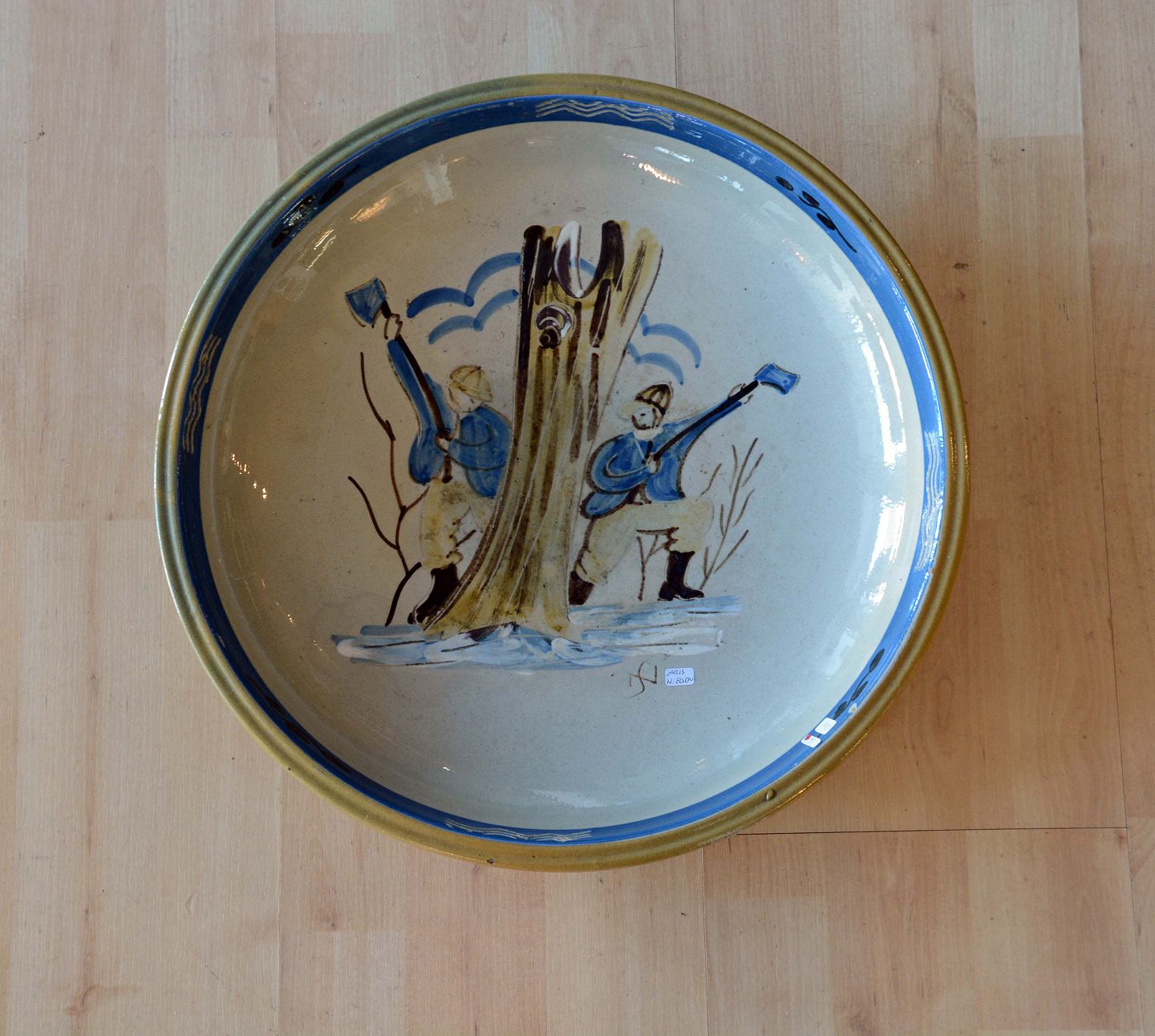 Keramikfad med motiv af 2 skovarbejdere designet af Jais Nielsen