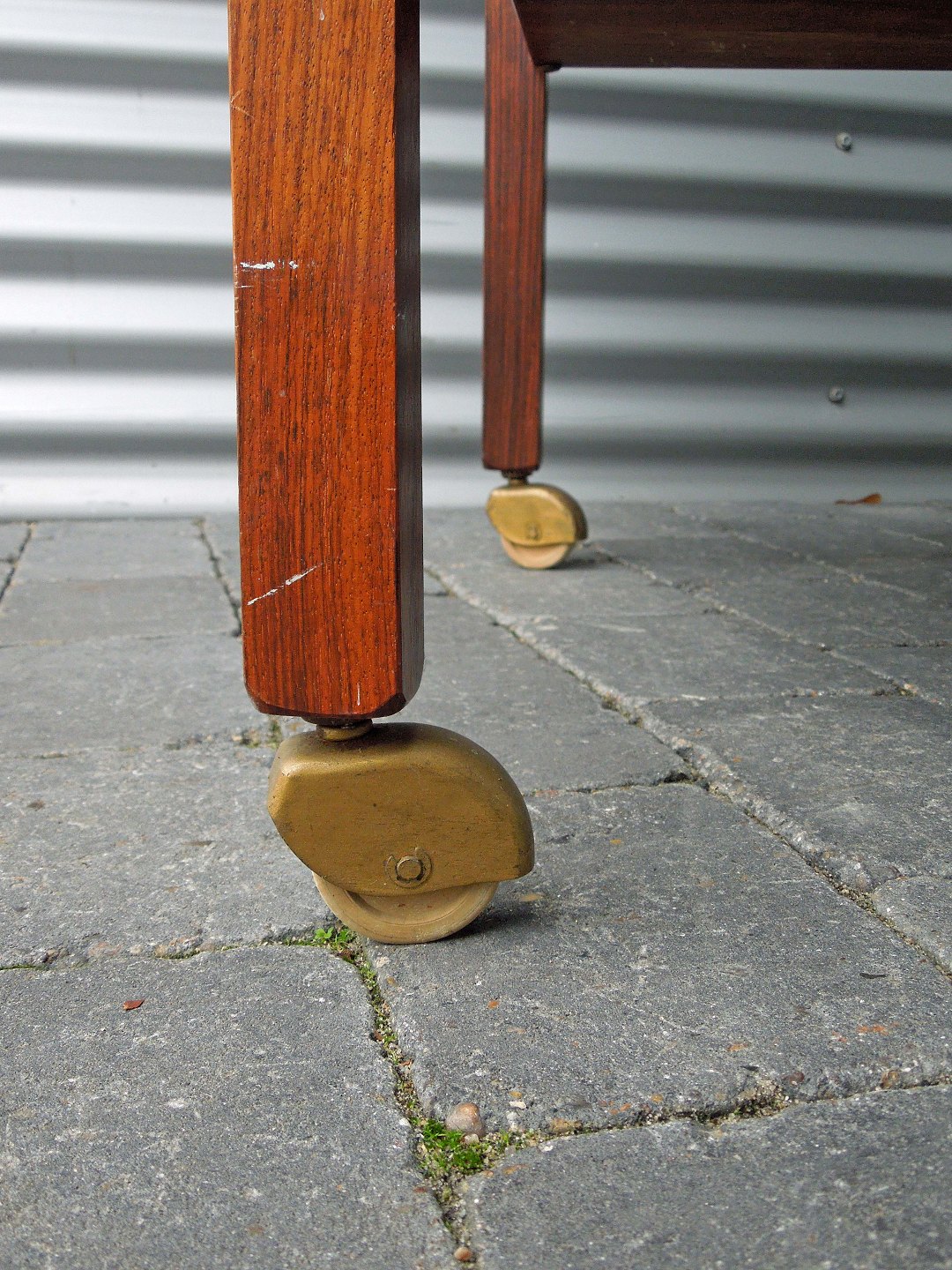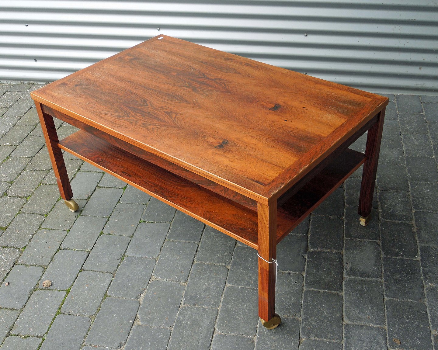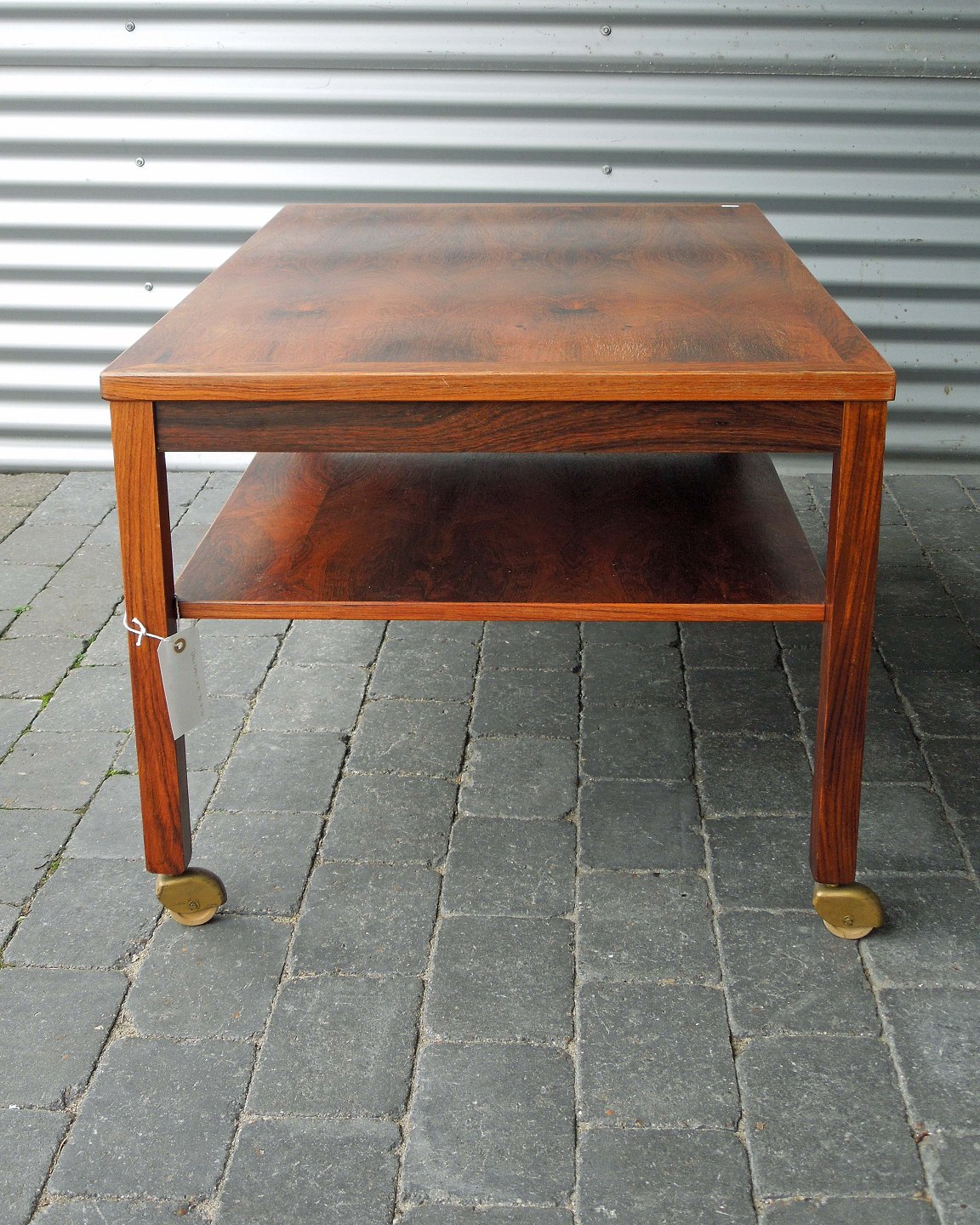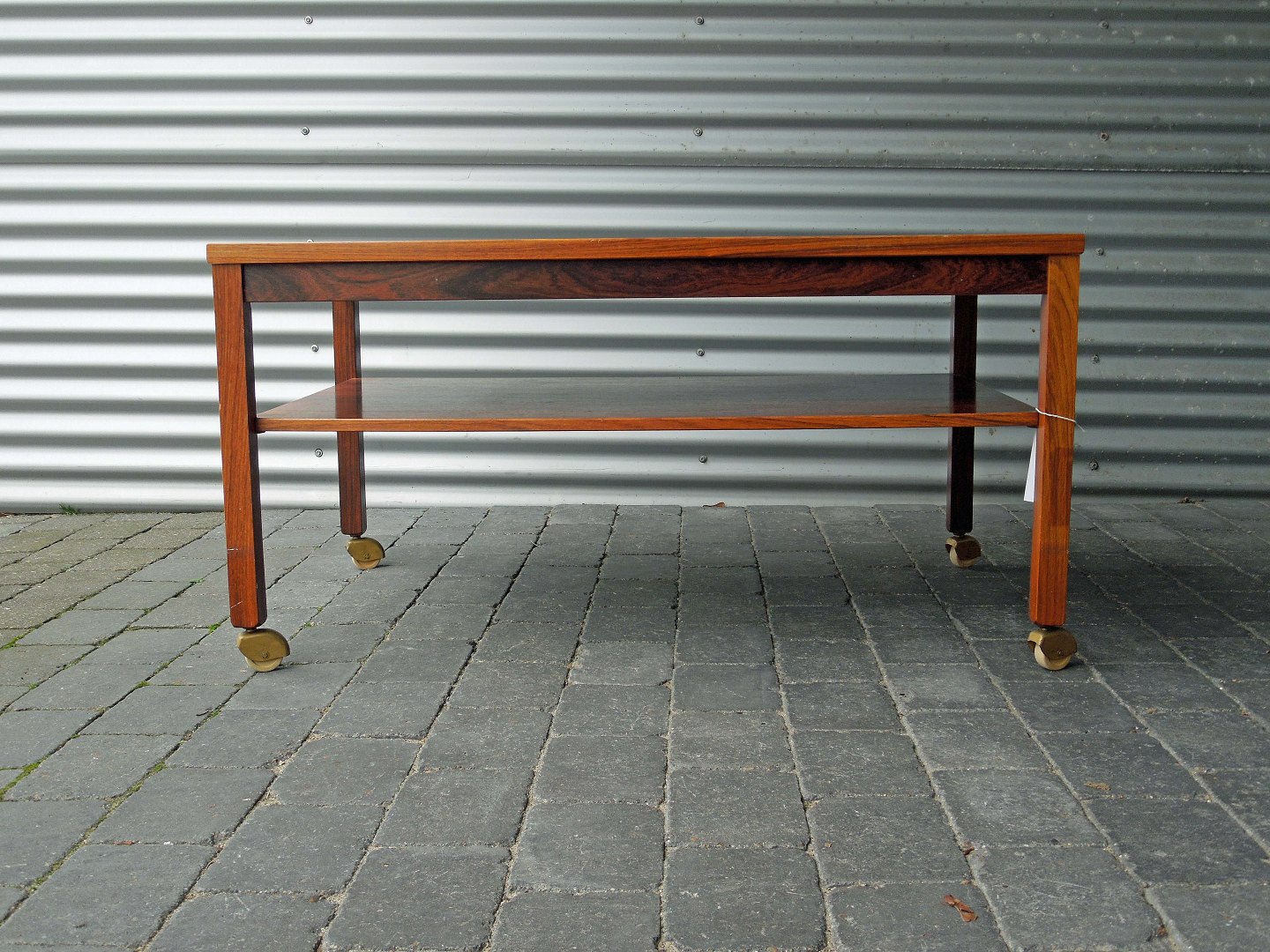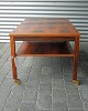 Sofaborde med hylde og 4 hjul. Bordet er i lakeret palisander og fremstår med lettere slid på bordpladen.