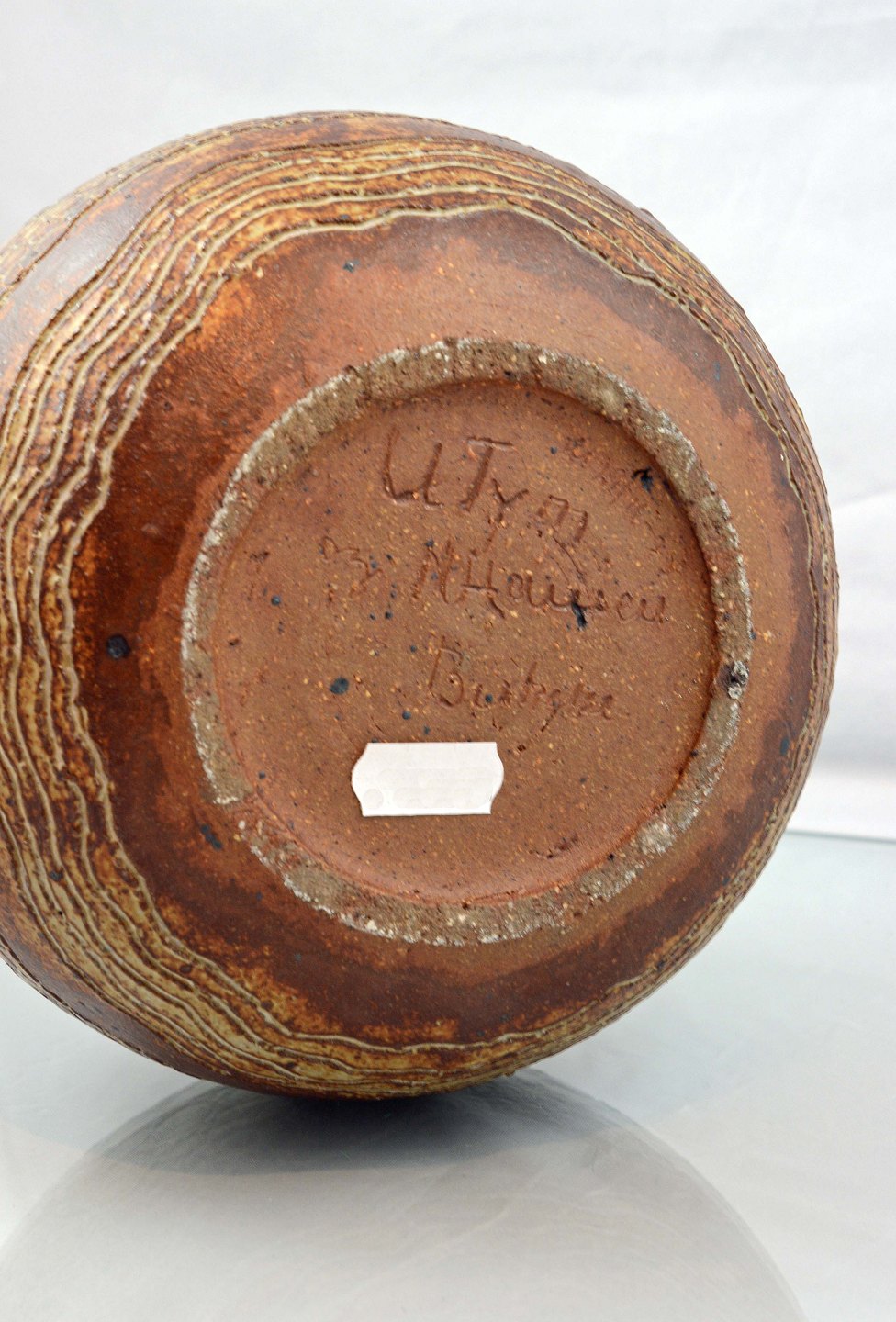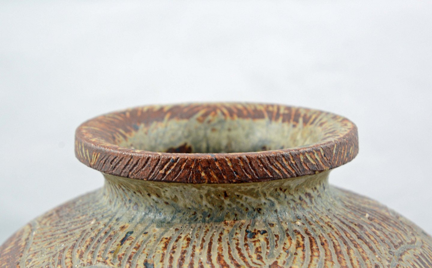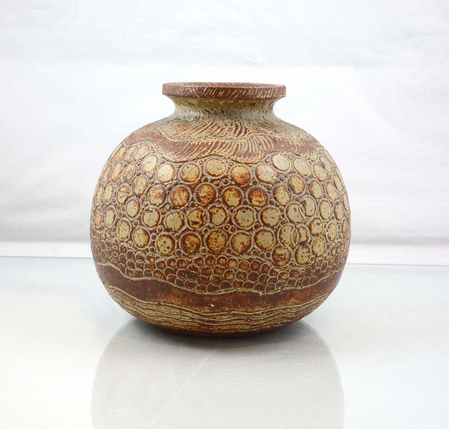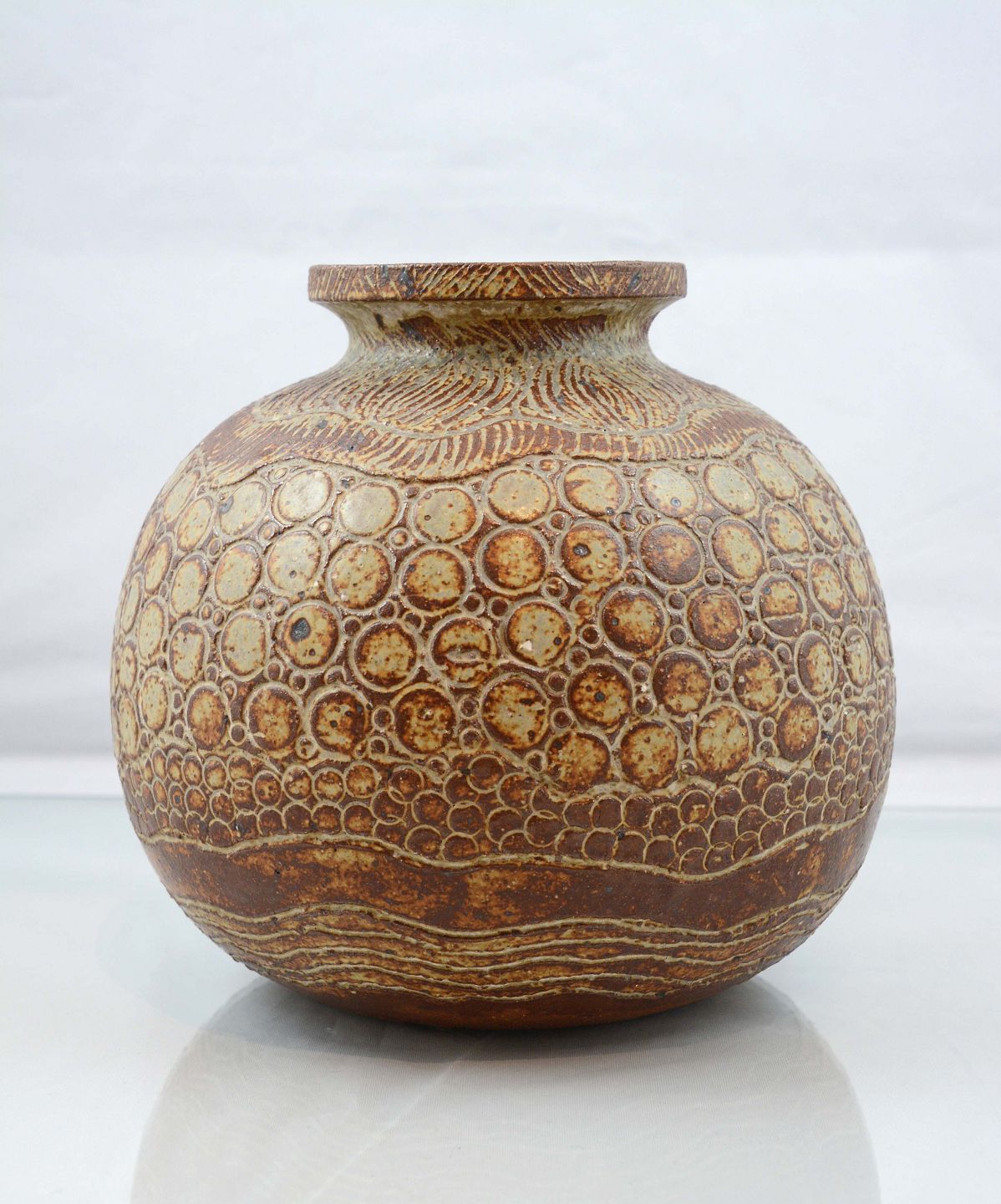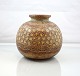 Unika vase i brun keramik med mønster.