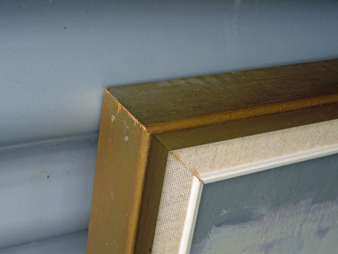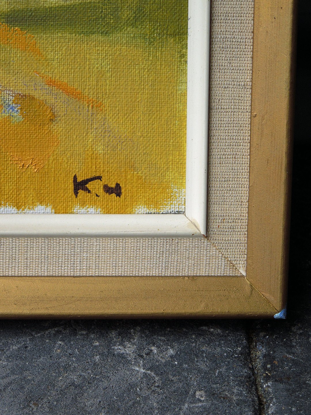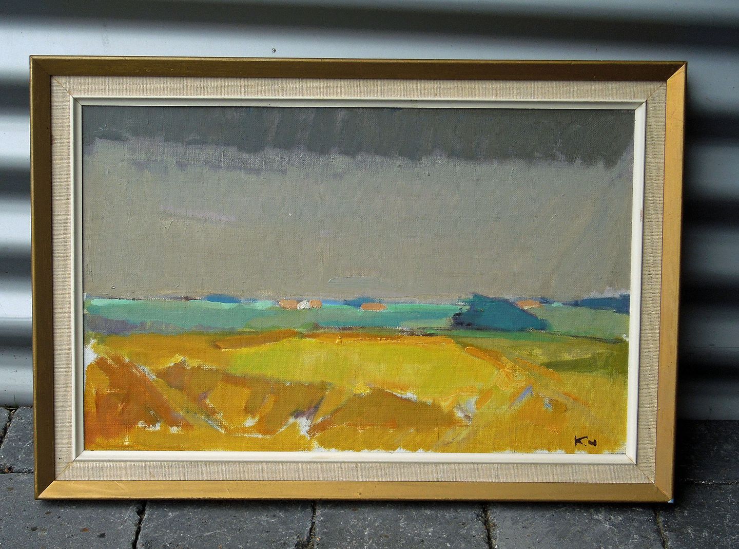 Olie på lærred. Maleri af landskab i gylden træramme af Kaj Helledie. Sign. "k m". Fremstår med brugsspor på rammen.