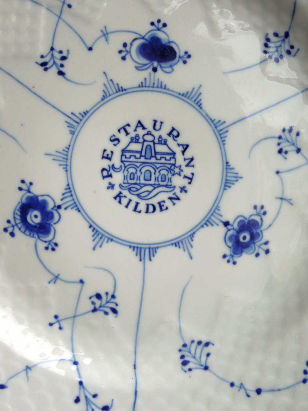 3 middagstallerkner (nr. 1009) i blåmalet hotelporcelæn fra Bing og Grøndahl, Danmark. Tallerknerne er fra "Restaurant Kilden" - det nuværende Hotel det hvide hus og fremstillet i kraftigt porcelæn / jernporcelæn. Lettere brugsspor kan forekomme.