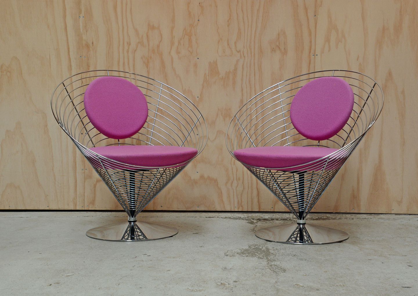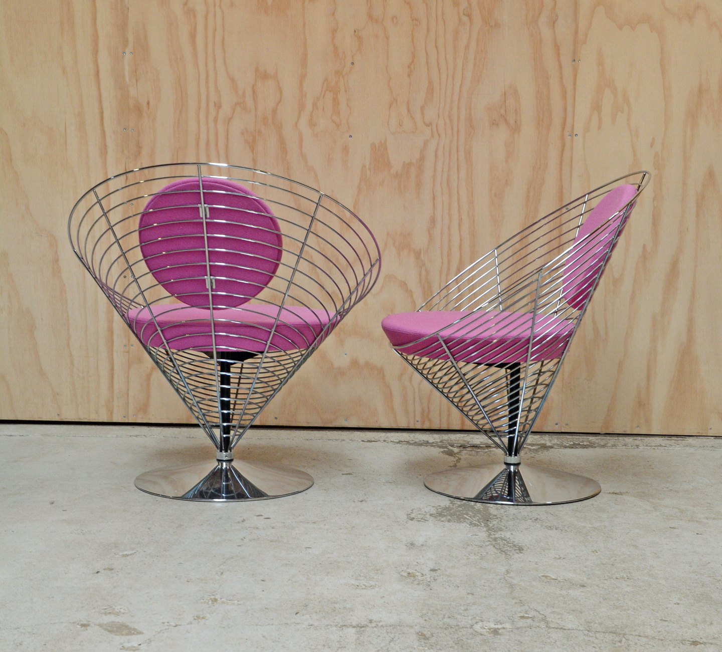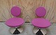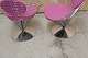 2 kræmmerhusstole designet af Verner Panton for Fritz Hansen. Stolene har stel af krom og polstrede sæde- og ryghynder med stofbetræk. Også kaldet Conechair. Meget få brugsspor på et stofbetræk.