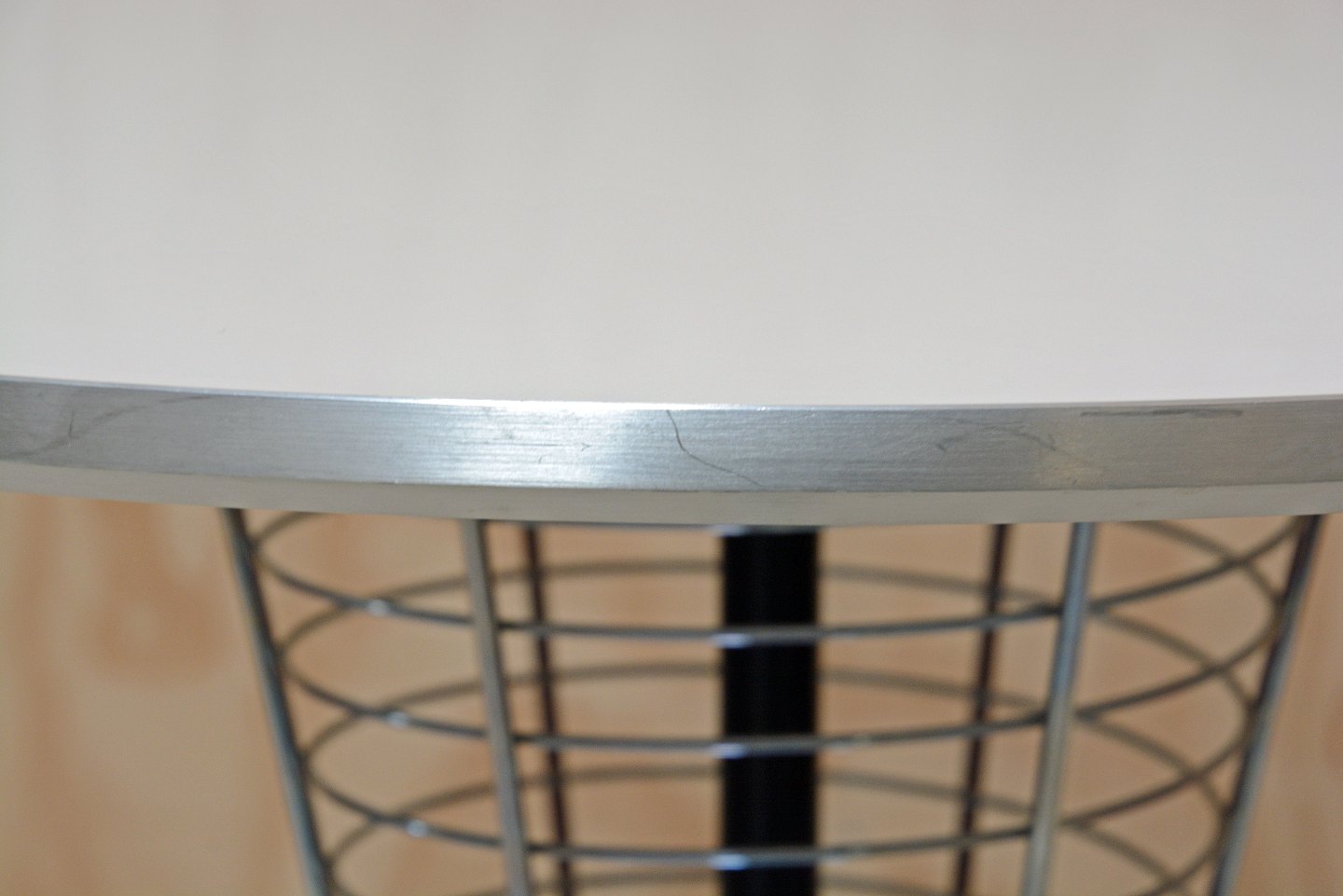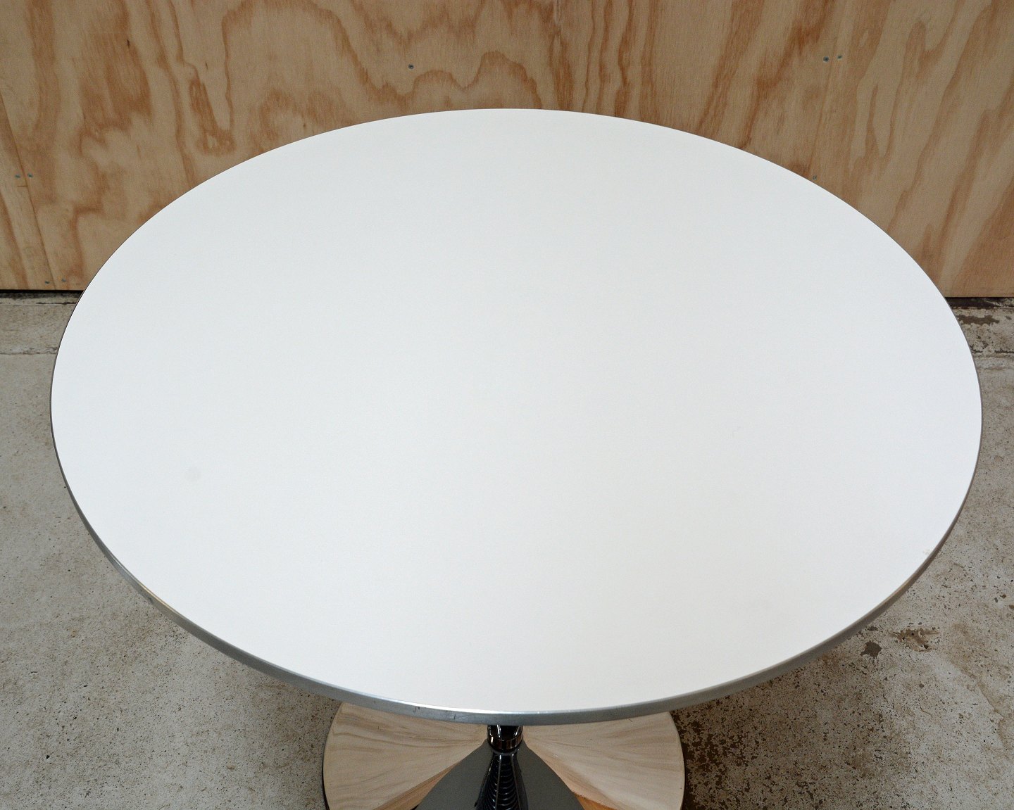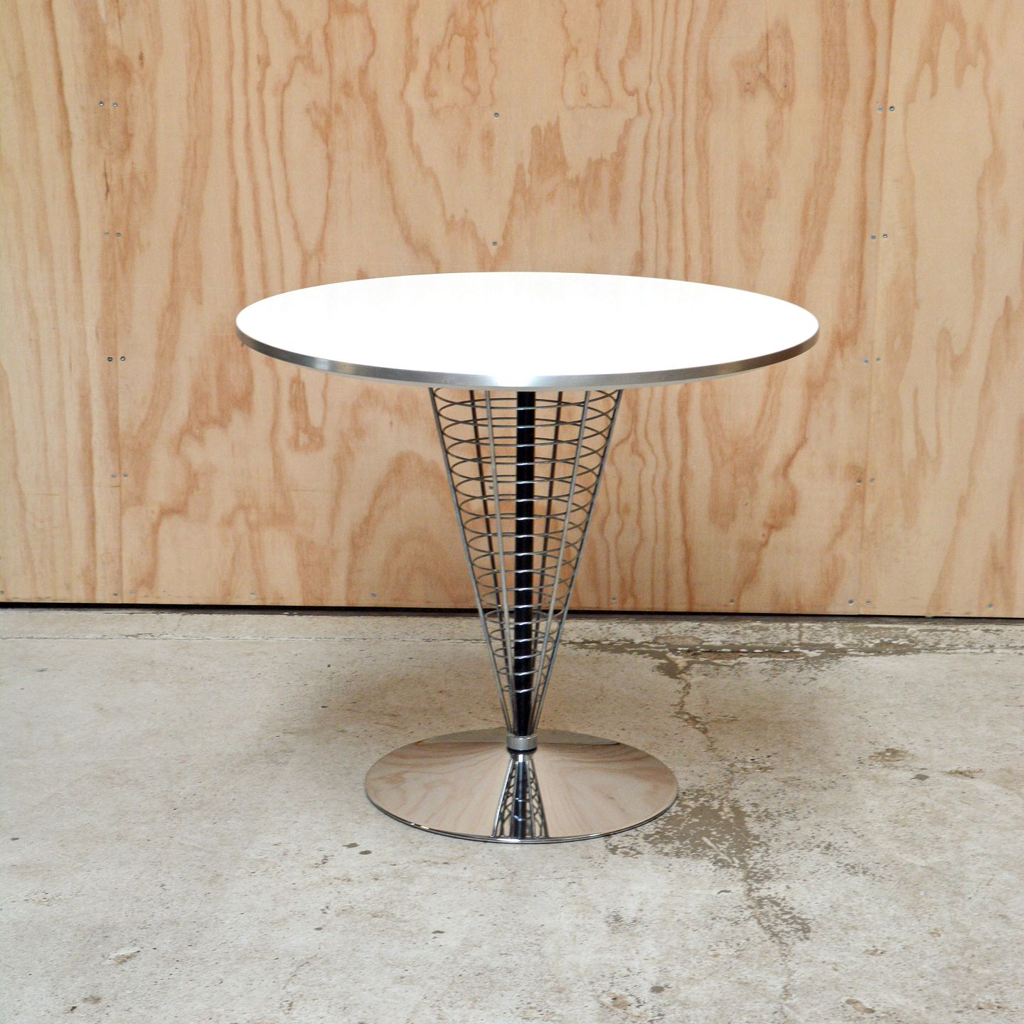 Sofabord designet af Verner Panton for Fritz Hansen. Lavet til kæmmerhusstolene. Bordet har stel af krom med hvid Formica bordplade. Enkelte brugsspor på bordpladen.