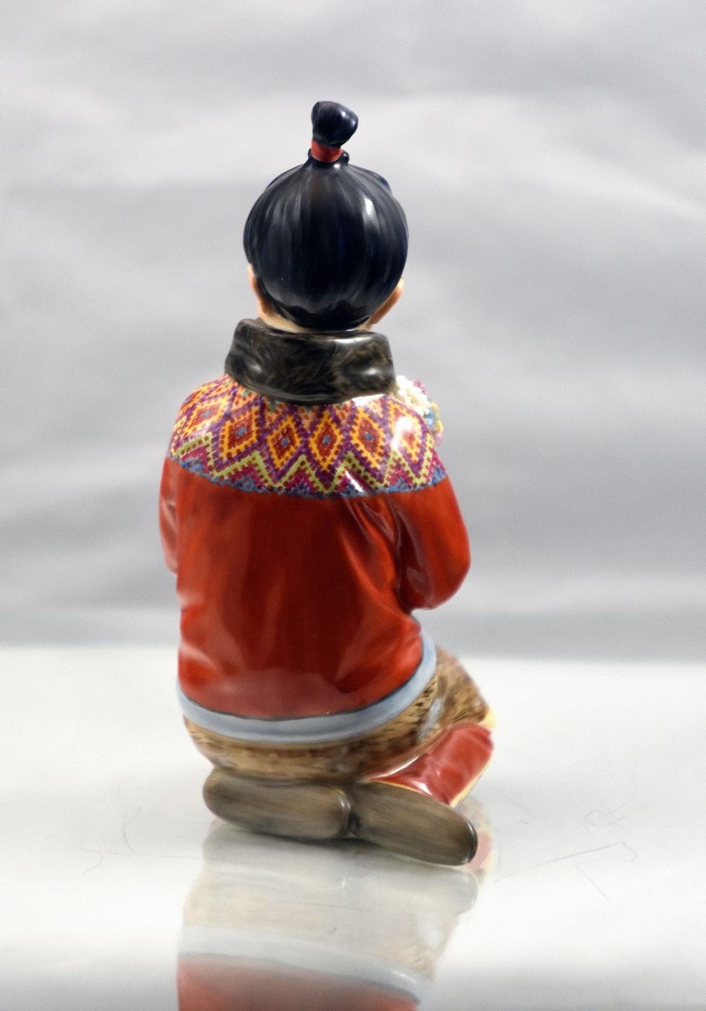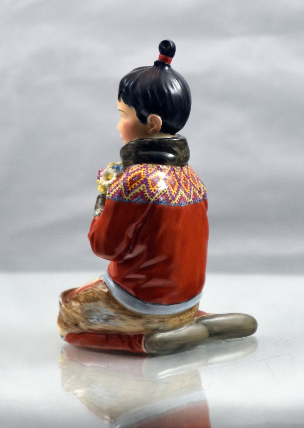 Kongelig figur af Grønlandskkvinde i nationaldragt. Hun sidder med blomster i hænderne. Den kongelig, kgl figur er overglasseret.
