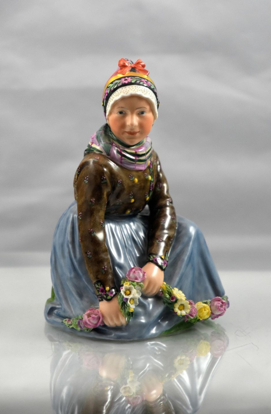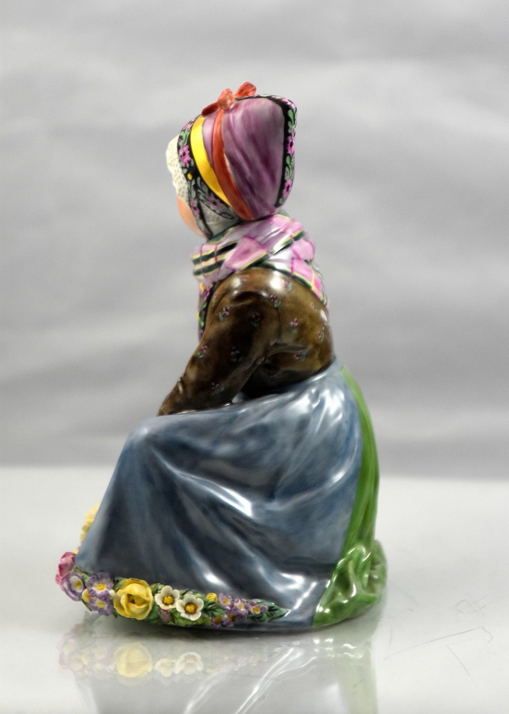 Kvinde i egnsdragt fra Fanø, hun sidder på hug og laver blomsterranker overglassur