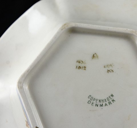 Rundt fajancefad fra Kgl./Aluminia, dekoreret med egern i bunden, der er en blå bølget kant på fadet (1436/1012) ja mystisk ligner kunstserien Efterår af Nils Thorsson, 1925-29, men kan ikke finde den på listen.