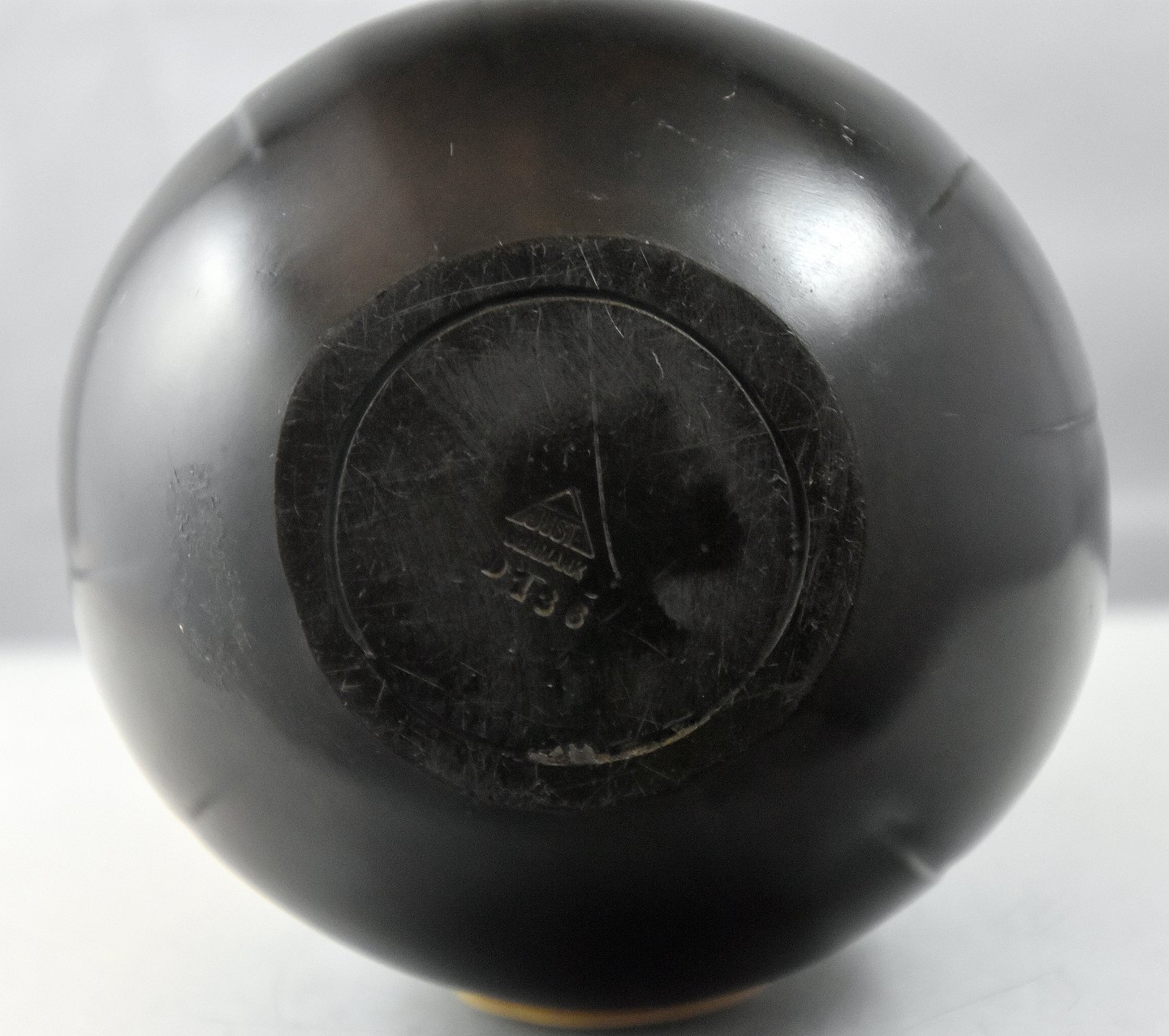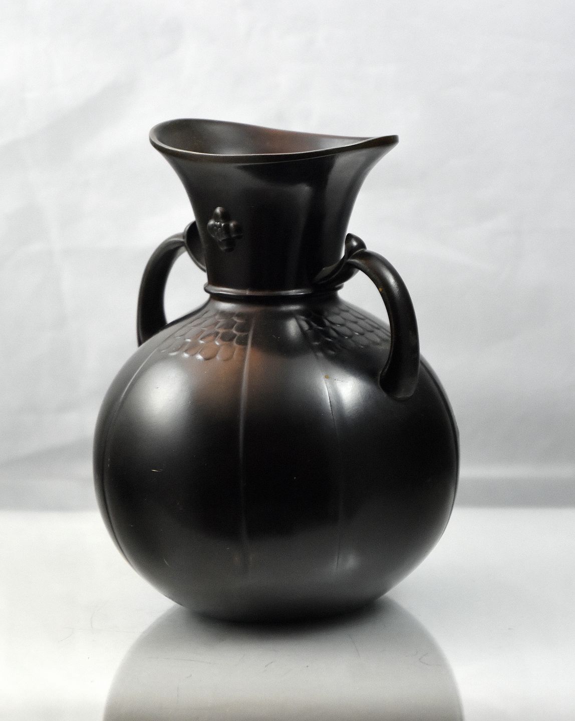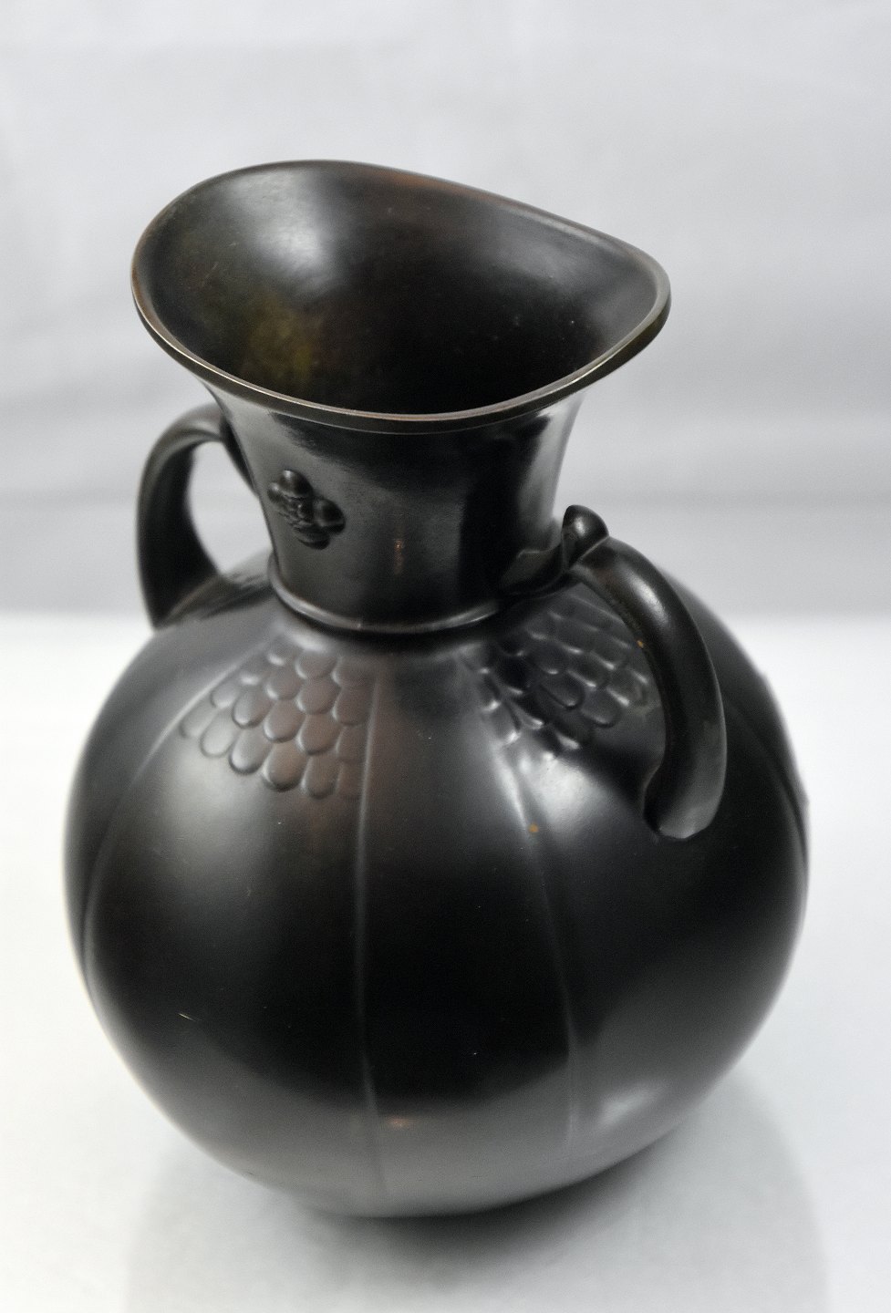 Just Andersen, kugleformet vase af Diskometal (D136), med hals og hanke. Stemplet monogram Just A