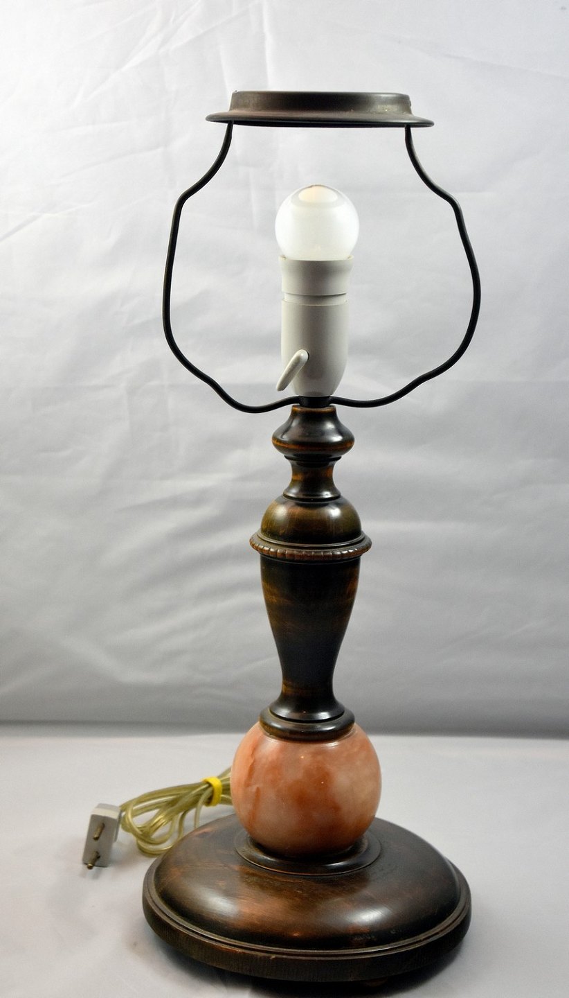 Bordlampe af træ med marmorkugle