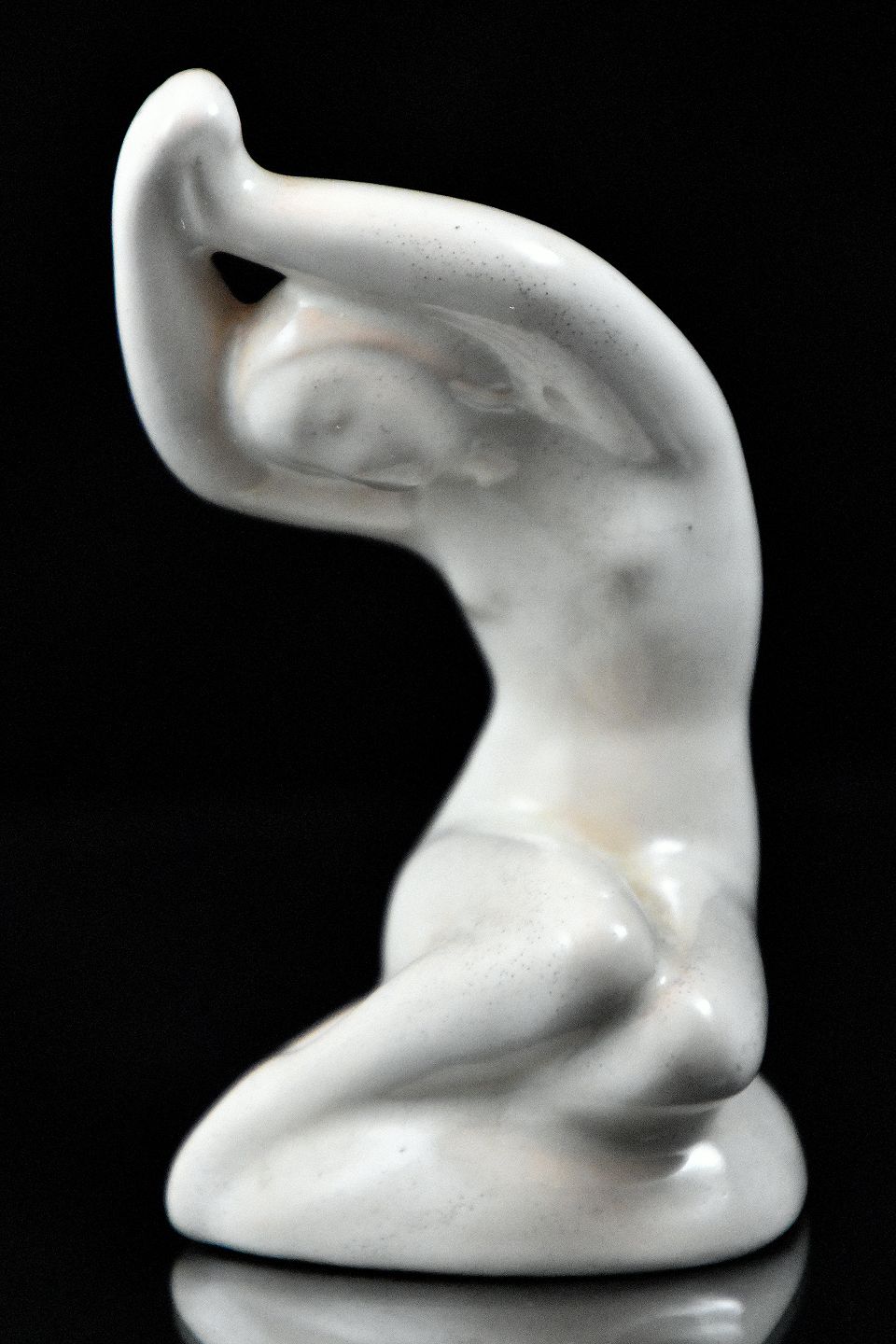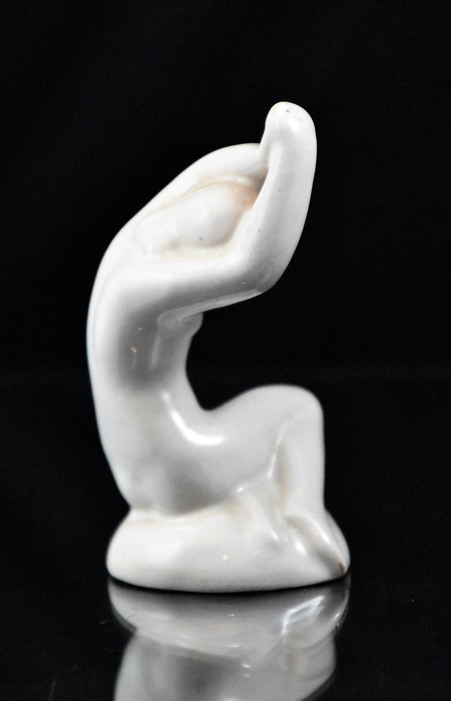 Figur i hvid-glaseret keramik med motiv af siddende nøgen kvinde nr. 573A