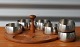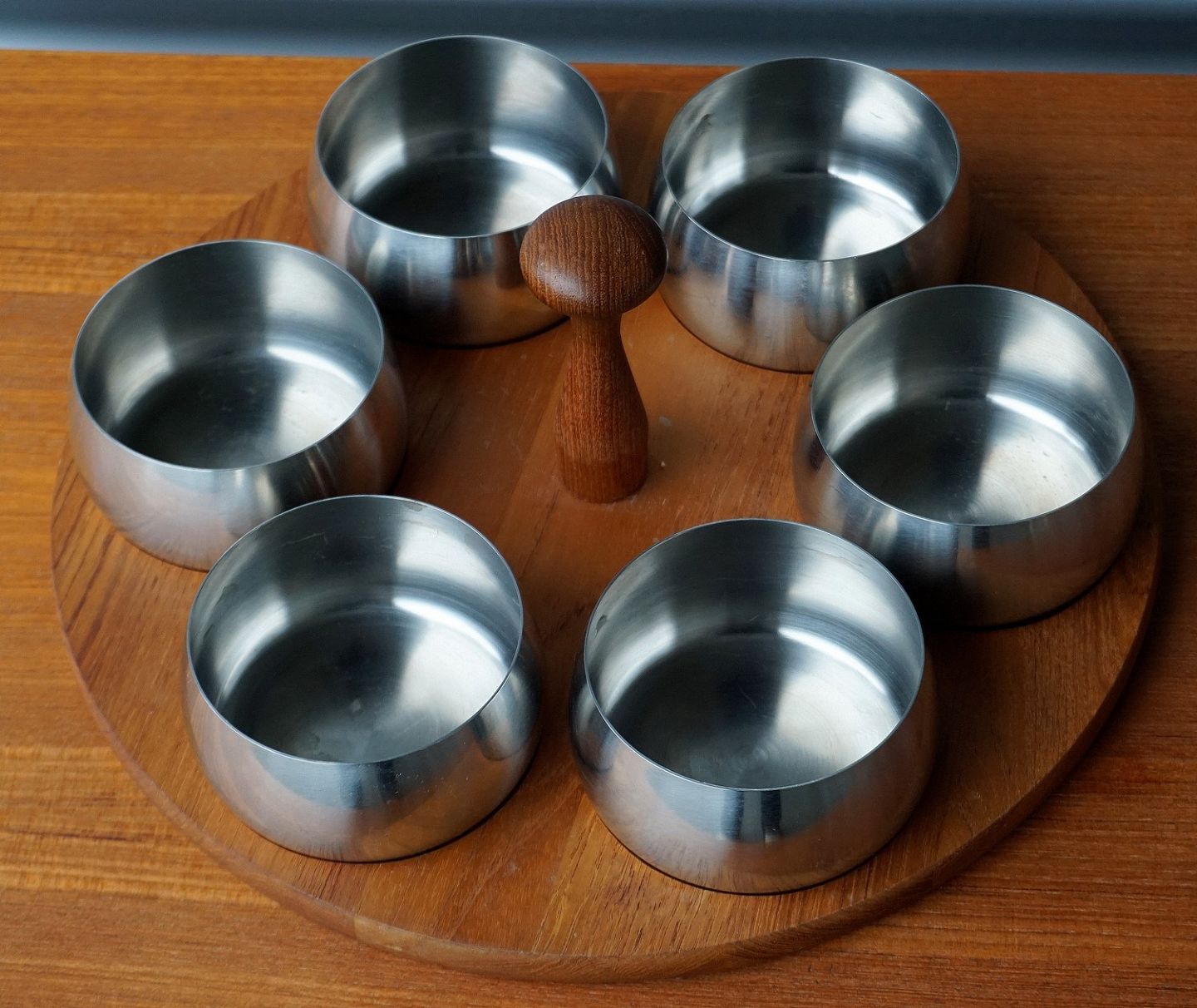 Cabaret fad/tapasfad i teak træ og stålskåle. skålene er Lundtofte stanlees steel.