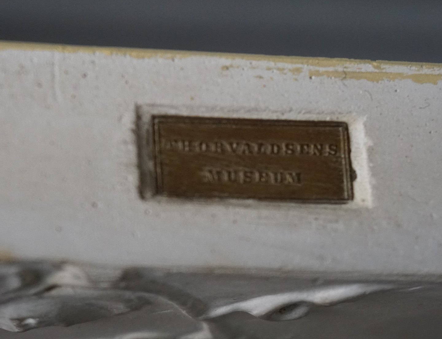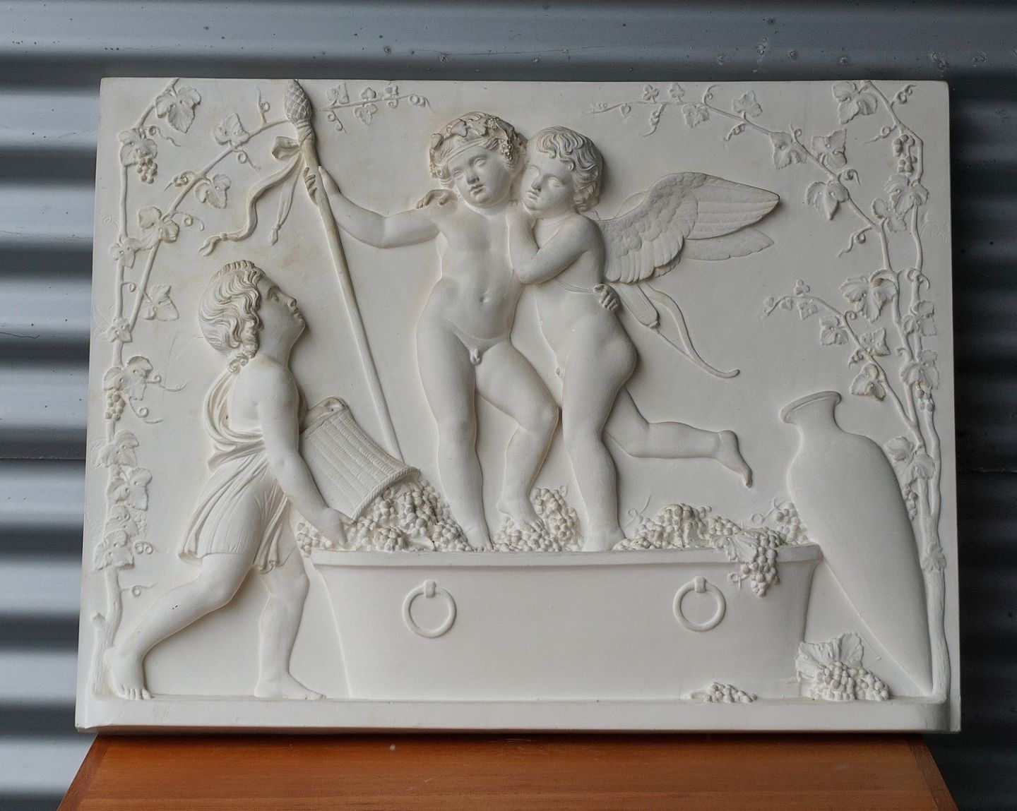 4-kantet gips relief (Bertel Thorvaldsen 1770-1844) fra Thorvaldsens Museum. Forestiller en mytologisk scene, hvor elskovsguden Amor, sammen med vinguden Bacchus sørger for vinhøsten. De er ved at stampe vindruesaft ud.