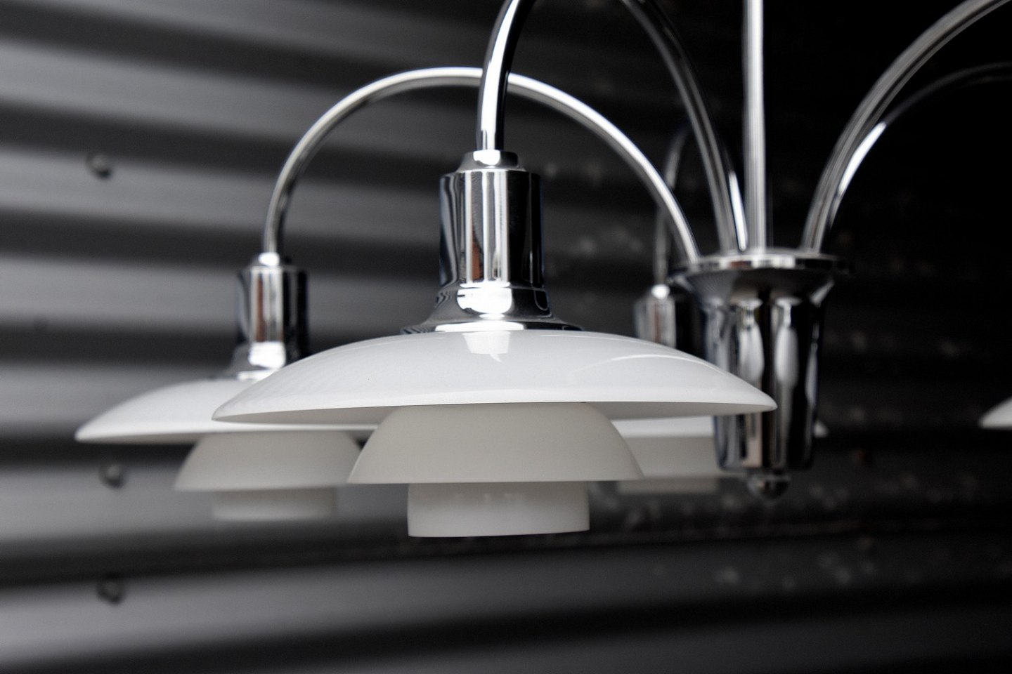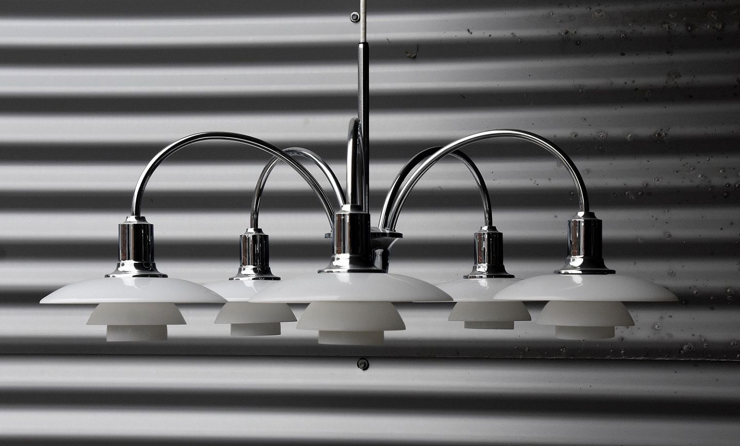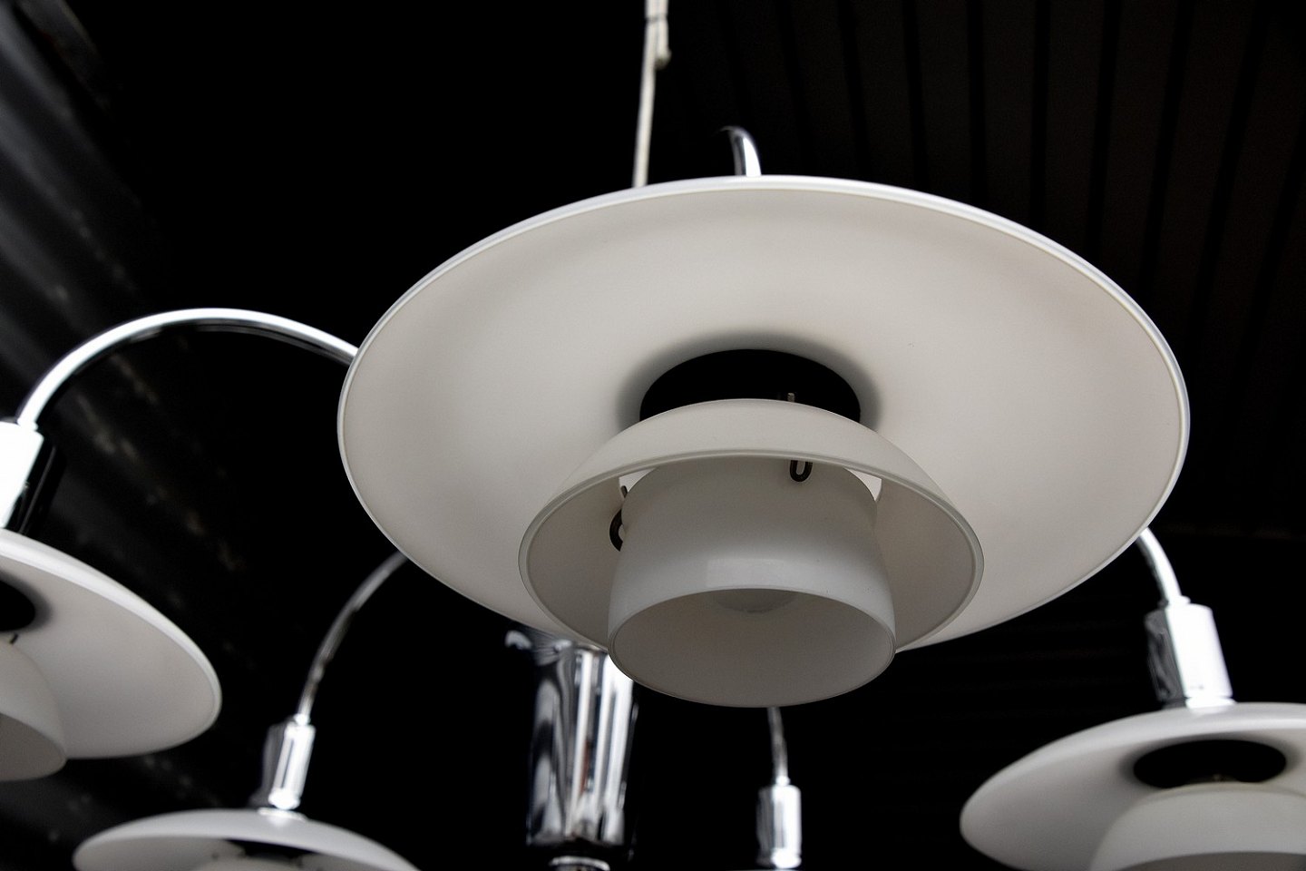 PH Jubilæumslampe, Bombadement Krone, lysekrone med 5-armet forkromet stel. Skærme (2/1) opalglas. Fremstillet i 1999 i forbindelse med Louis Poulsens 125års-jubilæum (med nummerbevis) arkivfoto
