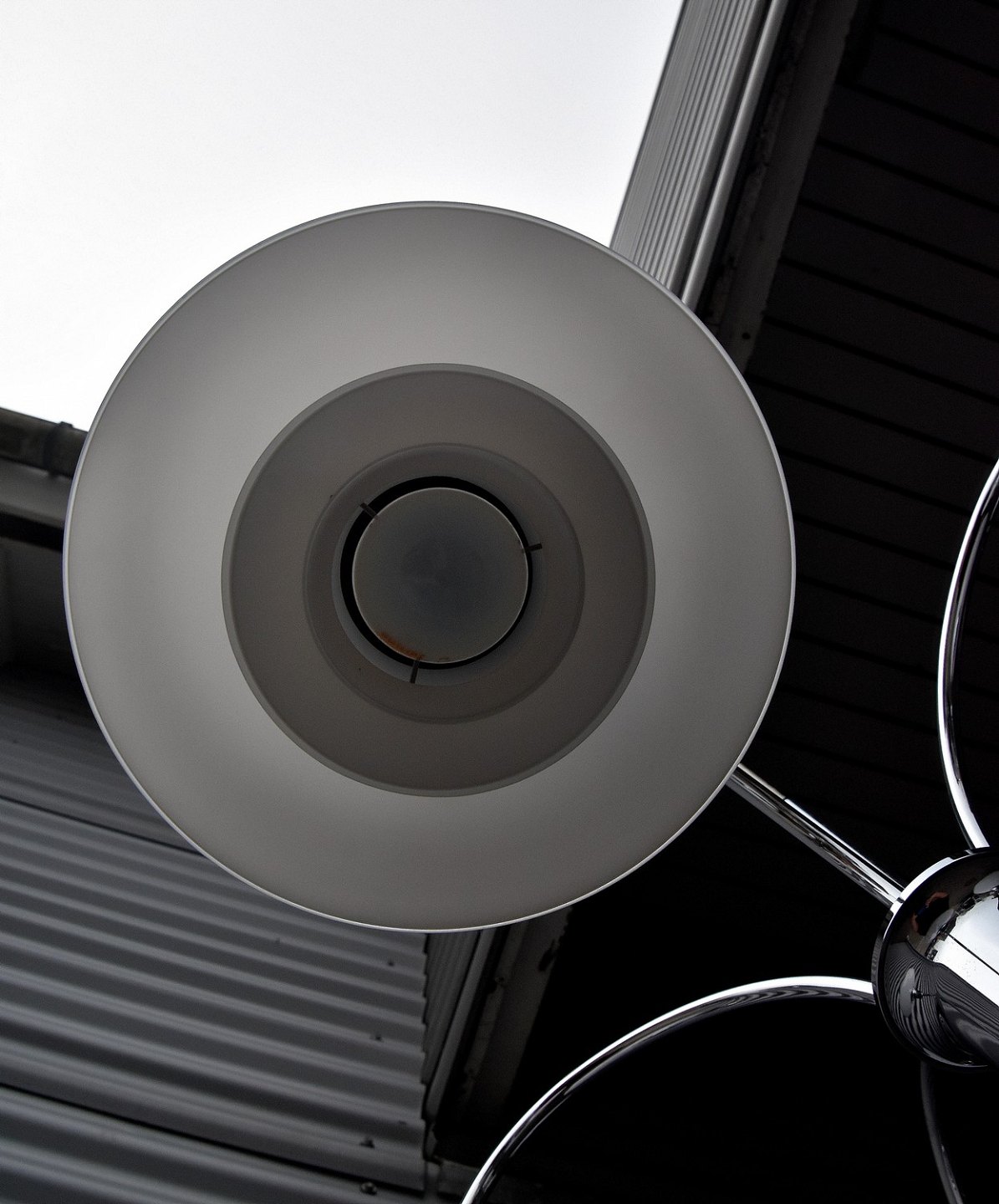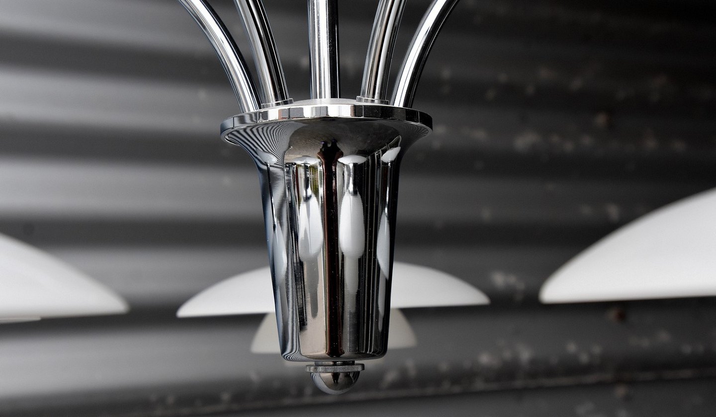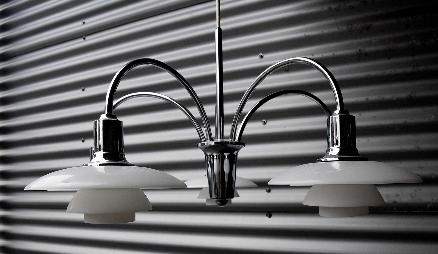 PH Jubilæumslampe, Bombadement Krone, lysekrone med 5-armet forkromet stel. Skærme (2/1) opalglas. Fremstillet i 1999 i forbindelse med Louis Poulsens 125års-jubilæum (med nummerbevis) arkivfoto